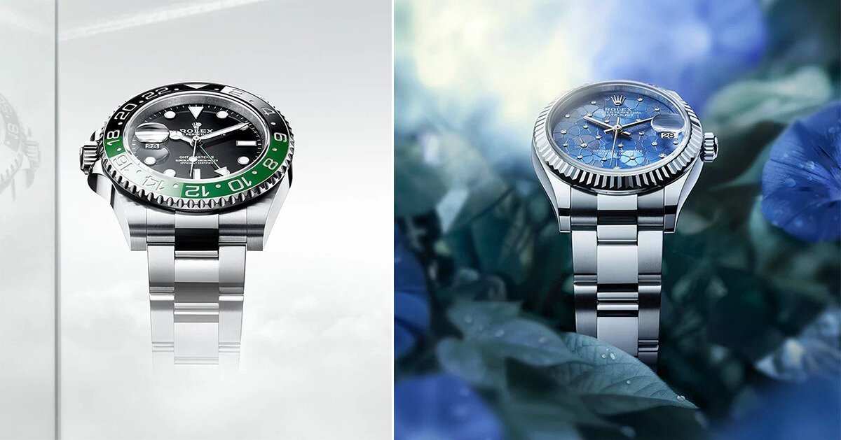 another model, day-date 40 comes with a fine aesthetic imbued in blue hues. the ice blue dial remains the distinctive marker of rolex watches in platinum. this version of the oyster perpetual day-date 40 consists of a blue seconds hand and faceted, deconstructed roman numerals and faceted hour markers in white gold. in similar bluish tones comes the redesigned dayjust 31 combining three different finishes: sunray, matt, and grained. the floral-motif dials splash with color, overflowing with fresh energy. the textural effects are further emphasized by 24 diamonds of varying sizes, which illuminate the center of each flower.