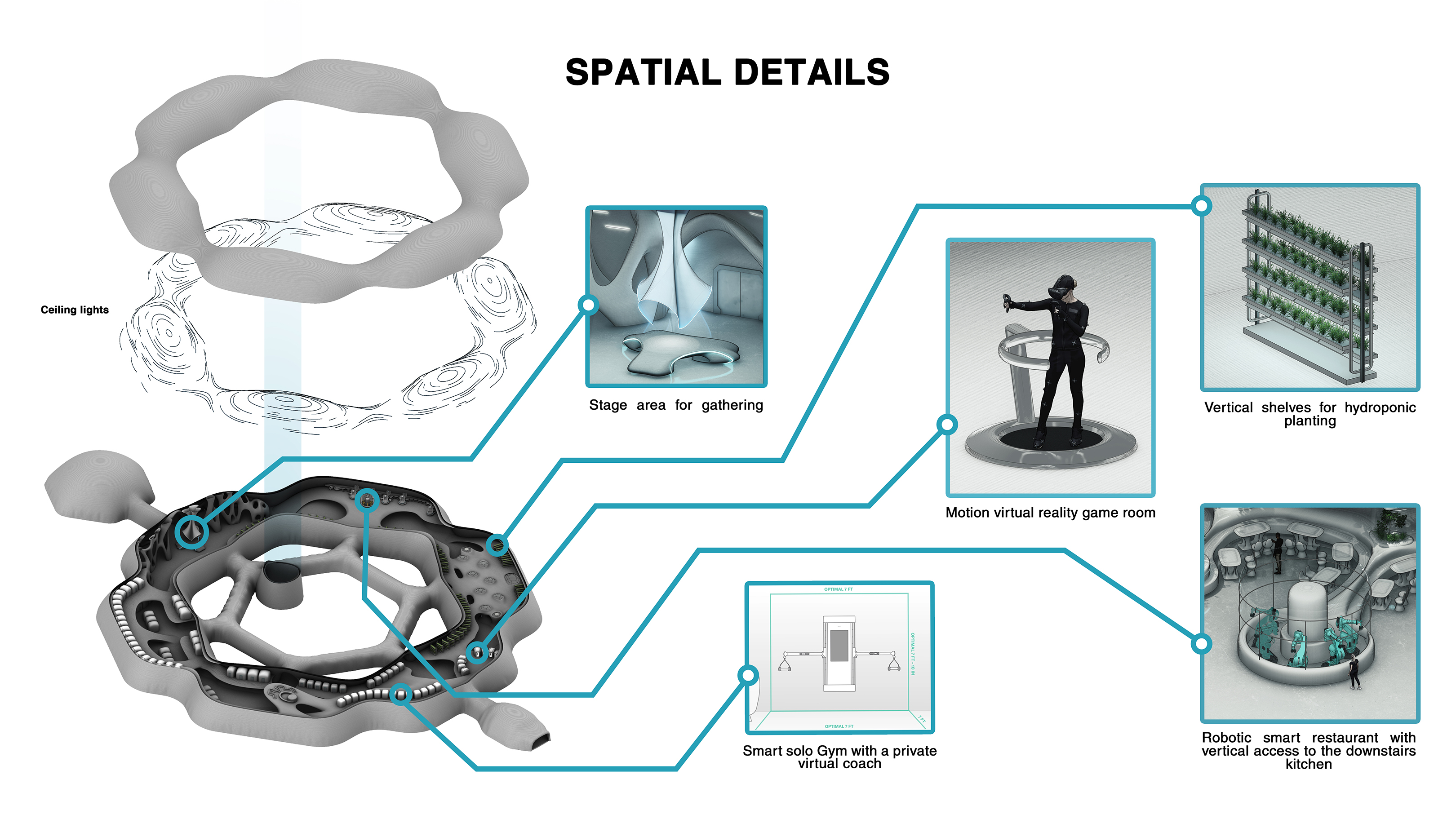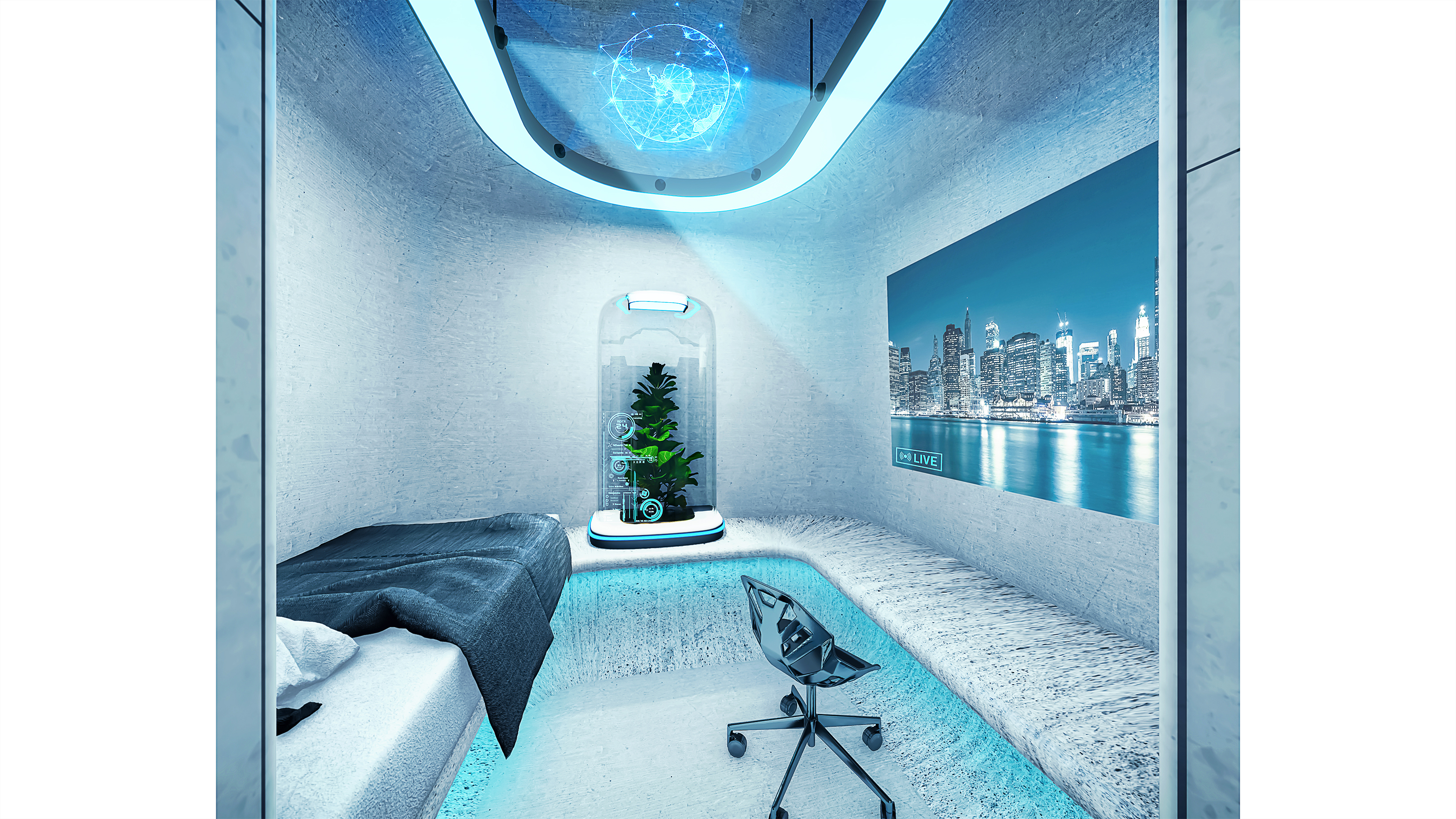 Due to the possibility of meteor showers and solar radiation, and due to the lack of the atmosphere on the surface of the moon, this village is located in a depth of 80 meters below the lava tube which is connected to the surface of the moon by Skylight.
