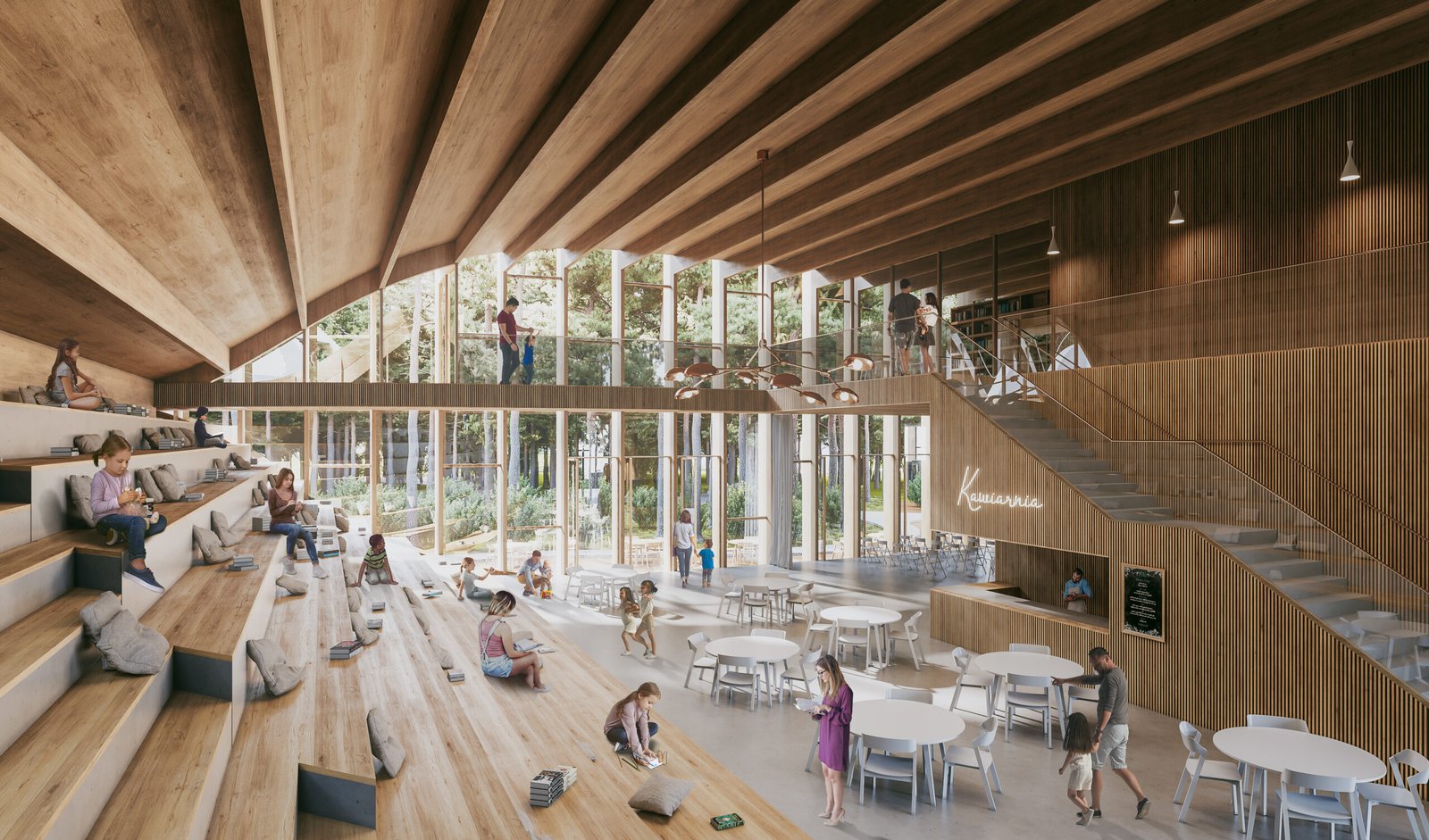 Entropic designed this unbuilt library and kindergarten to respond directly to its pine-covered site on the outskirts of Warsaw. They sourced timber from nearby forests and arranged the two volumes to follow the rhythm of the trees. Prefabricated timber pods form classrooms and reading spaces that open to daylight while minimizing disruption to the landscape. By working with local materials and preserving existing trees, the design reduces construction impact and creates a low carbon setting for learning and play.