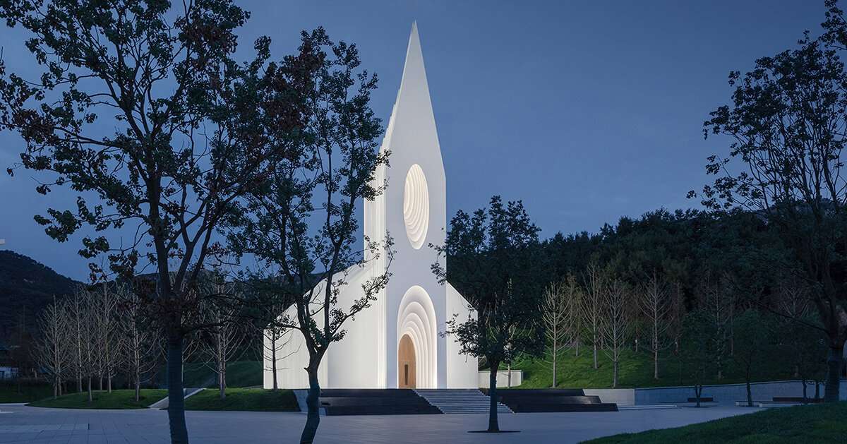 cologne-based, international firm RSAA has completed the ‘chamber church‘ in china, realized as a series of layered silhouettes. its white body stands pure against the surrounding greenery, while its facade rises up towards the sky which results in a sense of divinity. the final design takes shape as a symmetrical volume — penetrated from arcs — that gradually elevate, achieving a monumental composition. along with the axial expansion, the sacred light emitted by the church triggers passersby’s curiosity, inviting them to a ritual experience.