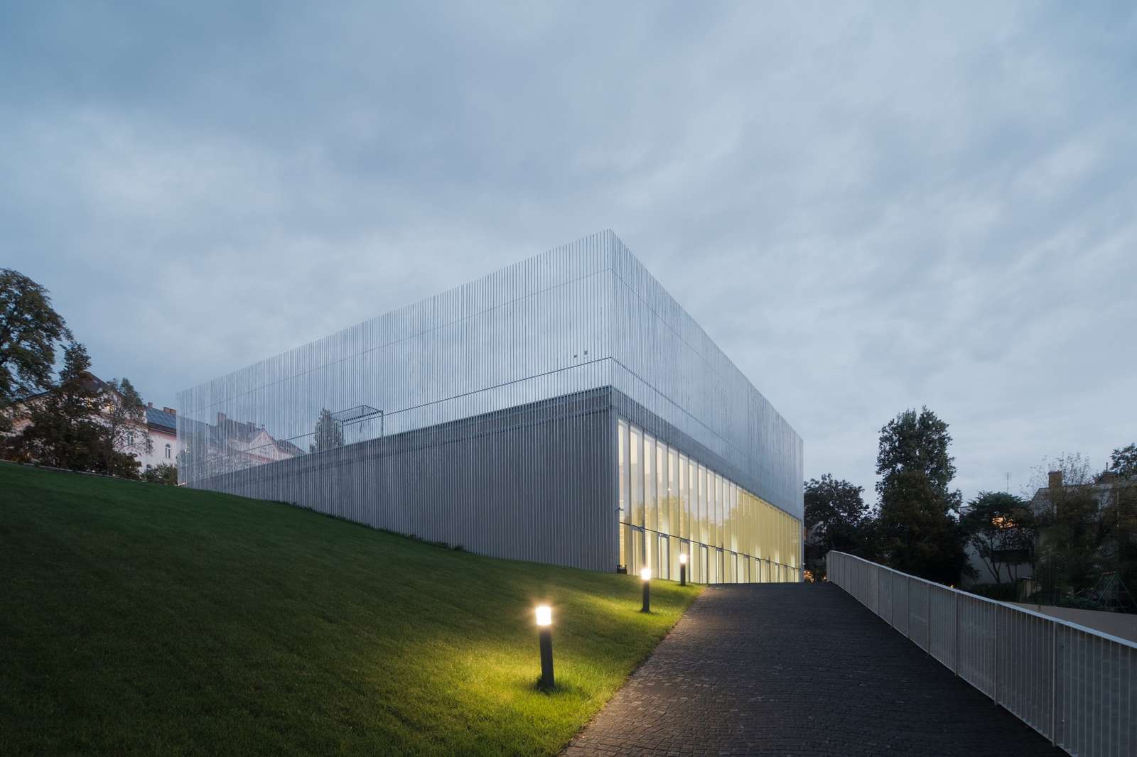 The garden where the new structure stands used to be formed by well-kept terraces, which character was lost during the Second World War. Restoring the garden with a defined slope and a terrace for the field evokes this long lost companion of the Neo-Baroque building.