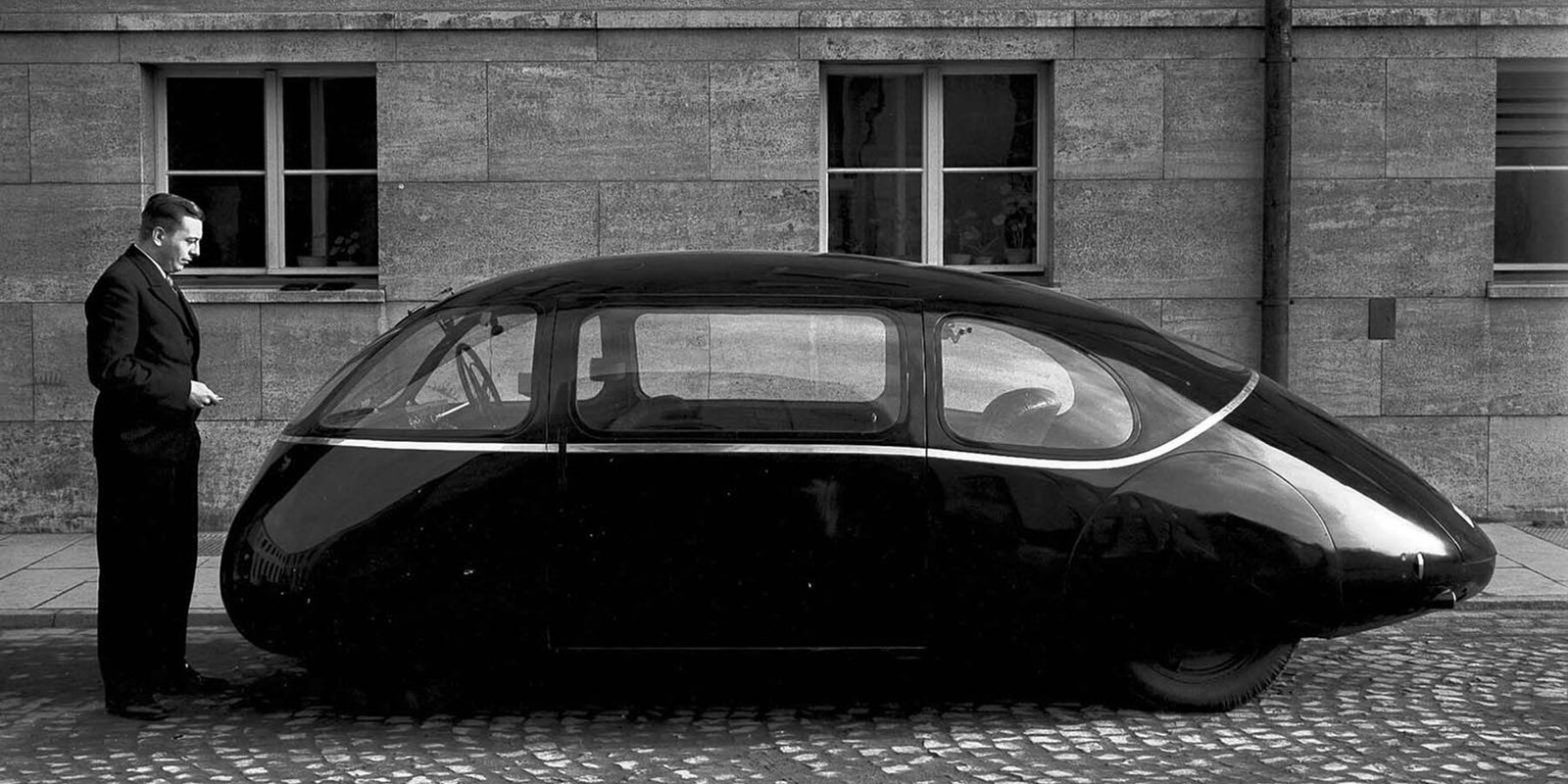 the teardrop-shaped schlörwagen was inspired by the anatomy of airplane wings