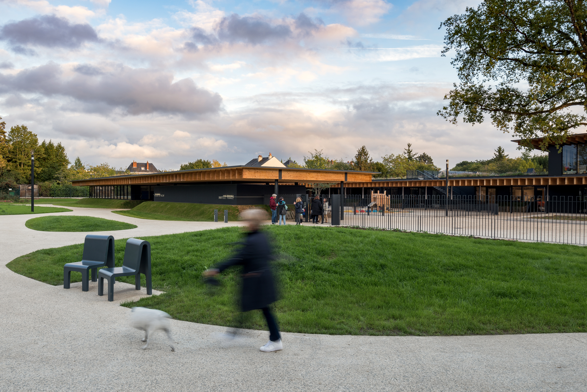 The project, located in the Parc de Montjoie in the centre of the town of Saint-Cyr-sur-Loire, comprises 5 nursery classes, 8 elementary classes, an after‑school facility, a catering unit and a sports facility designed for pupils and associations.