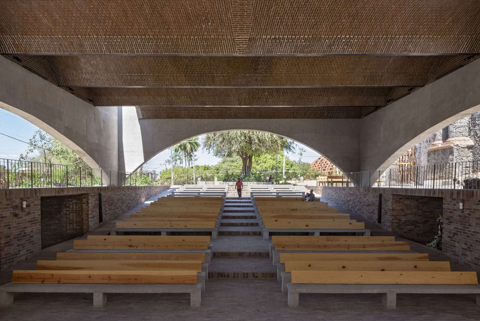 The project is developed from a large roof made up of brick vaults, supported by a cast-in-place concrete structure. The structure is resolved from a structural arch on each side that is supported only in the corners. This solution allows the passage of air and the entry of comfortable light for ceremonies, thus avoiding the use of mechanical air conditioning systems and excessive energy consumption in artificial lighting.