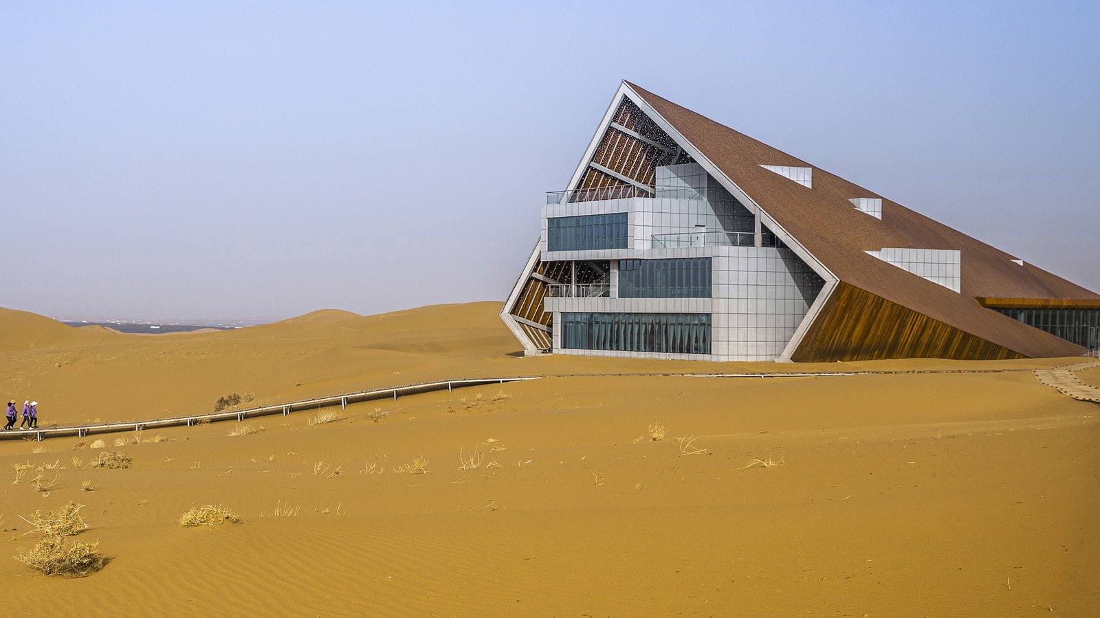 For a building in the desert, the architect hopes that it conforms to the temperament of the desert accordingly – mysterious, impermanent, calm and warm, just like so many stories about the desert. The architect chooses straight lines and geometric forms as the basic elements of the building, simulating a huge rectangular solid half buried in the yellow sand, and endows it with a narrative metaphor – the lost treasure box. A story carrier that is submerged in the desert and waiting to be found.