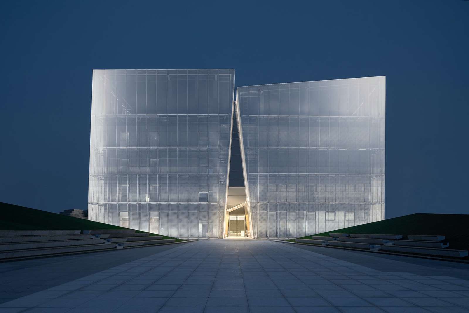 نستخدم الضوء الأبيض النقي والأصفر الدافئ المجازي لإظهار الشكل الخارجي. يبدو المبنى متكاملًا ونظيفًا ونقيًا. إنه الربيع الصافي الذي يتدفق من الشقوق الموجودة في الحجر. داخل المبنى ، نأمل أن تتحدى خيالك! الفناء المرتفع المكون من أربعة طوابق ، ومواد الصفيحة المثقبة على الواجهة ، تجعل مساحة الردهة شاملة للغاية ومصدمة.
