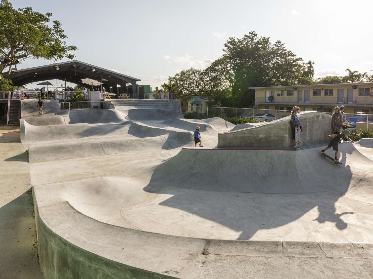 Text description provided by the architects. Located at the edge of Miami in the Village of El Portal sits the newly completed Skatebird Skatepark, a large open-air urban space that exists as a skatepark, event space, and place for the arts. At approximately 38,000 square feet, the skatepark consists of three parts: the skateable terrain, the enclosing walls, and the large roof that covers half the site, providing a dry and shady spot for visitors to escape harsh sunlight, as well as sporadic rainfall.