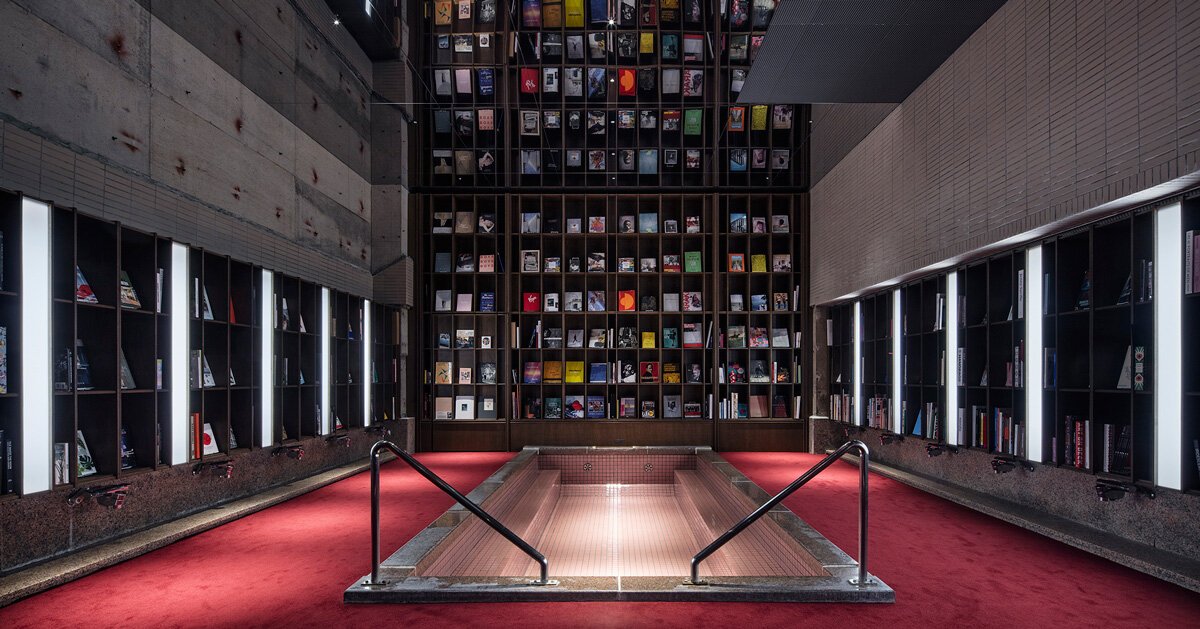 suppose design office has completed ‘matsumoto honbako’, a 24-room hot spring hotel that features open-air baths in all guest rooms, as well as a bookstore and restaurant. located in japan‘s matsumoto city, the renovated property is a place where past and present intersect. designed as a complex cultural facility, the project is centered on books while retaining elements of the former hot spring inn, which has been in business for over 300 years. the large banquet hall and communal bath of the inn now house a restaurant and library space, where the japanese architecture studio has transformed an old pool into a reading corner surrounded by thousands of books. this area features red carpet on the floors, which references rust preventive paint and adds warmth to the reinforced concrete interior.