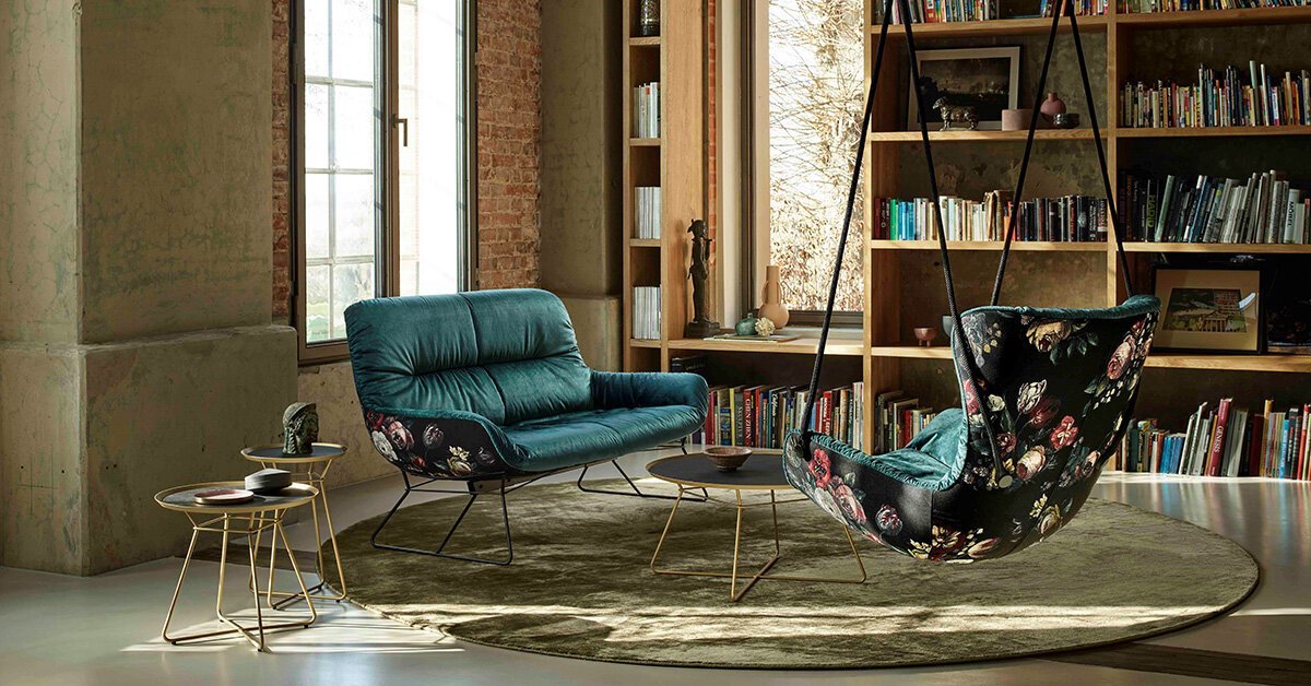 seating furniture covered with gobelin eden becomes a real eye-catcher in combination with other upholstery fabrics in intensive hues. but gray also goes perfectly with the floral motif and looks particularly distinguished when used in combination. those who like it more zestful and lively can opt for the leya wingback swingseat and let their imagination take flight: perhaps engaging in a game of make-believe, fancying oneself as a baroque-era countess or princely baron regally ensconced in the swing.