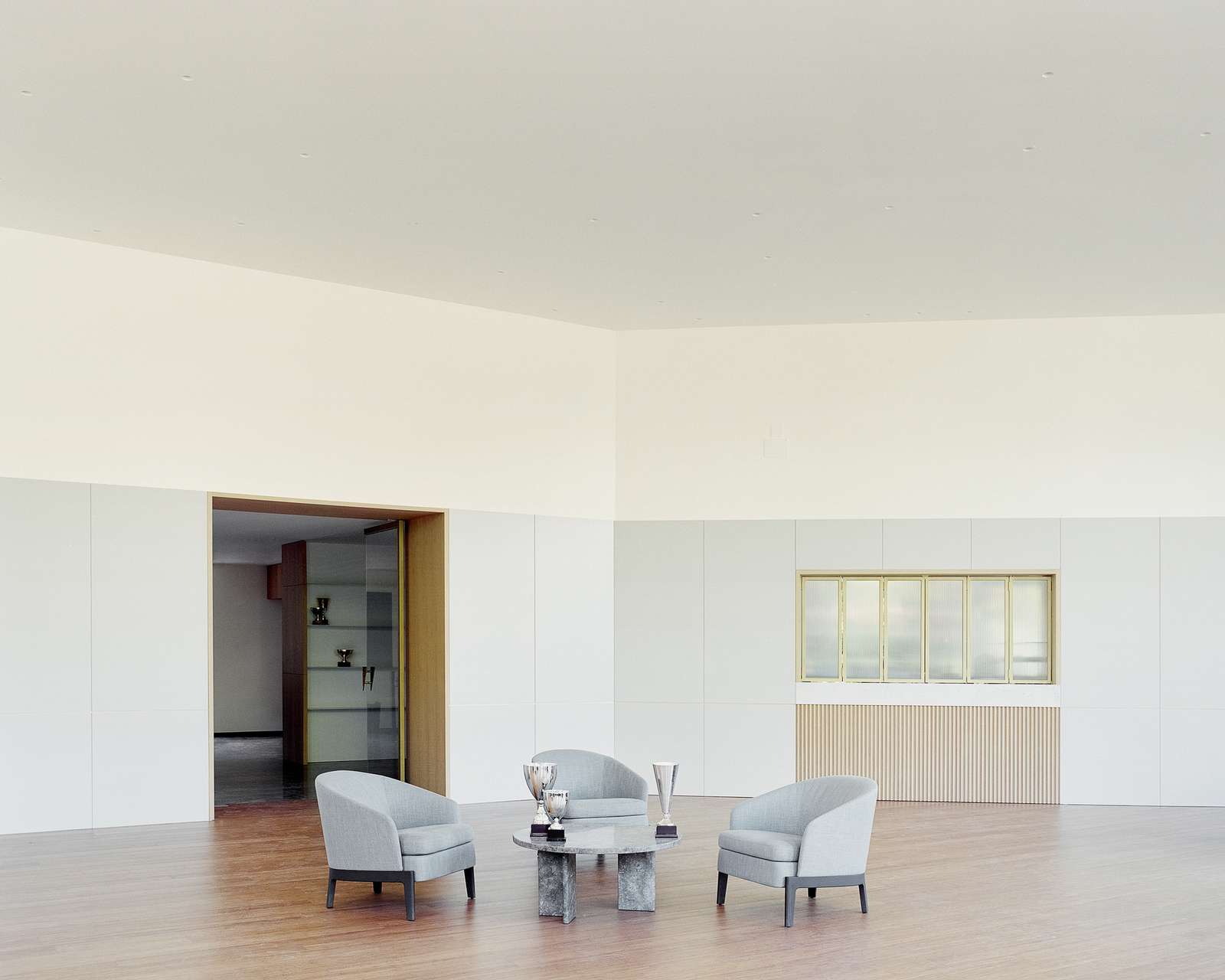 The desire to celebrate the victories conquered by the Club over the years finds its ultimate expression in the peculiarly shaped hexagonal room and it has indeed been reconfirmed by the realization of sheet metal shelves that follow the perimeter in a meticulous manner; the supports, extremely thin and white in color, blend completely with the wall, enhancing the real actors of the room: the trophies.