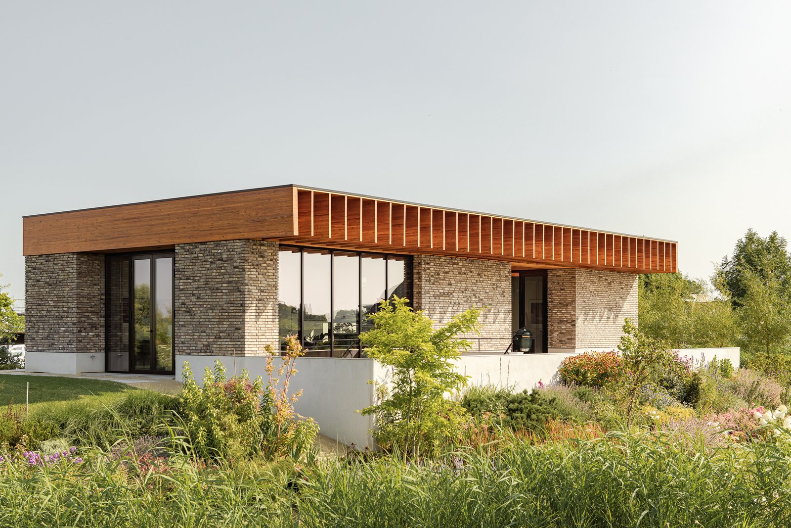 The pronounced wooden beam structure is continuous from the interior to the exterior and forms a canopy on the south facade. As a result, the boundary between the living room, veranda, outdoor rooms, and patio becomes indistinct and the landscape flows into the house.