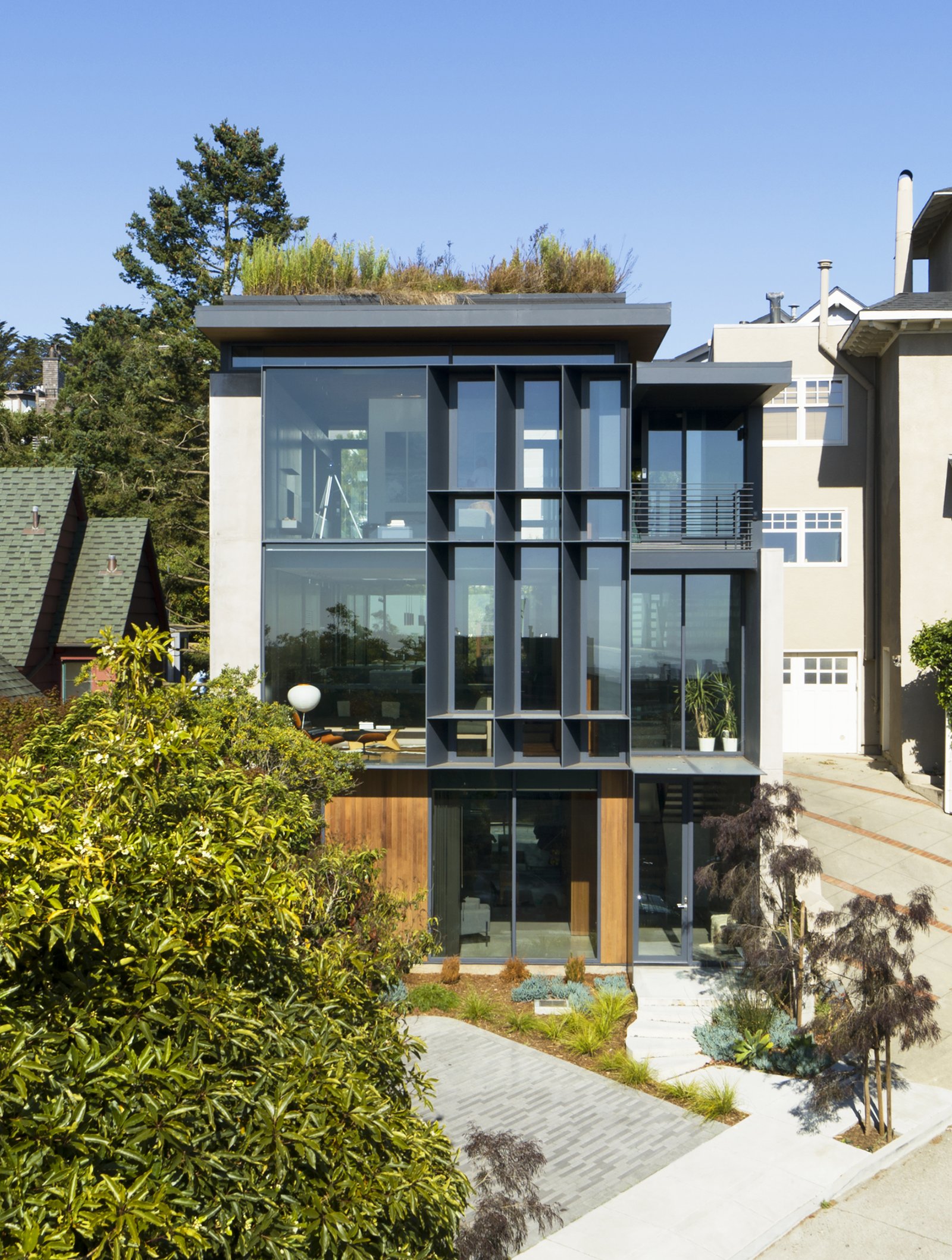 Text description provided by the architects. This dramatic remodel of a non-descript 1950s hillside residence converts a two-story structure into a three-story home for a growing family. The home boasts contrasting but remarkable views of the city of San Francisco to the east and Sutro Tower to the west. The front and rear facades employ 20-foot-tall, 30-inch-deep steel brise soleils to deflect light and simultaneously frame cherished views while editing out less desirable ones. The southern and northern anchor walls are skinned with hand-troweled plaster and create visual and mental privacy from the adjoining neighboring homes. In between these walls reside crystalline glass-and-steel exterior structures that provide the family with remarkable eastern views of downtown San Francisco and beautiful sunset views through a canopy of backyard trees. A living roof provides ample insulation and rainwater purification as well as an inviting natural respite within the confines of an urban setting.