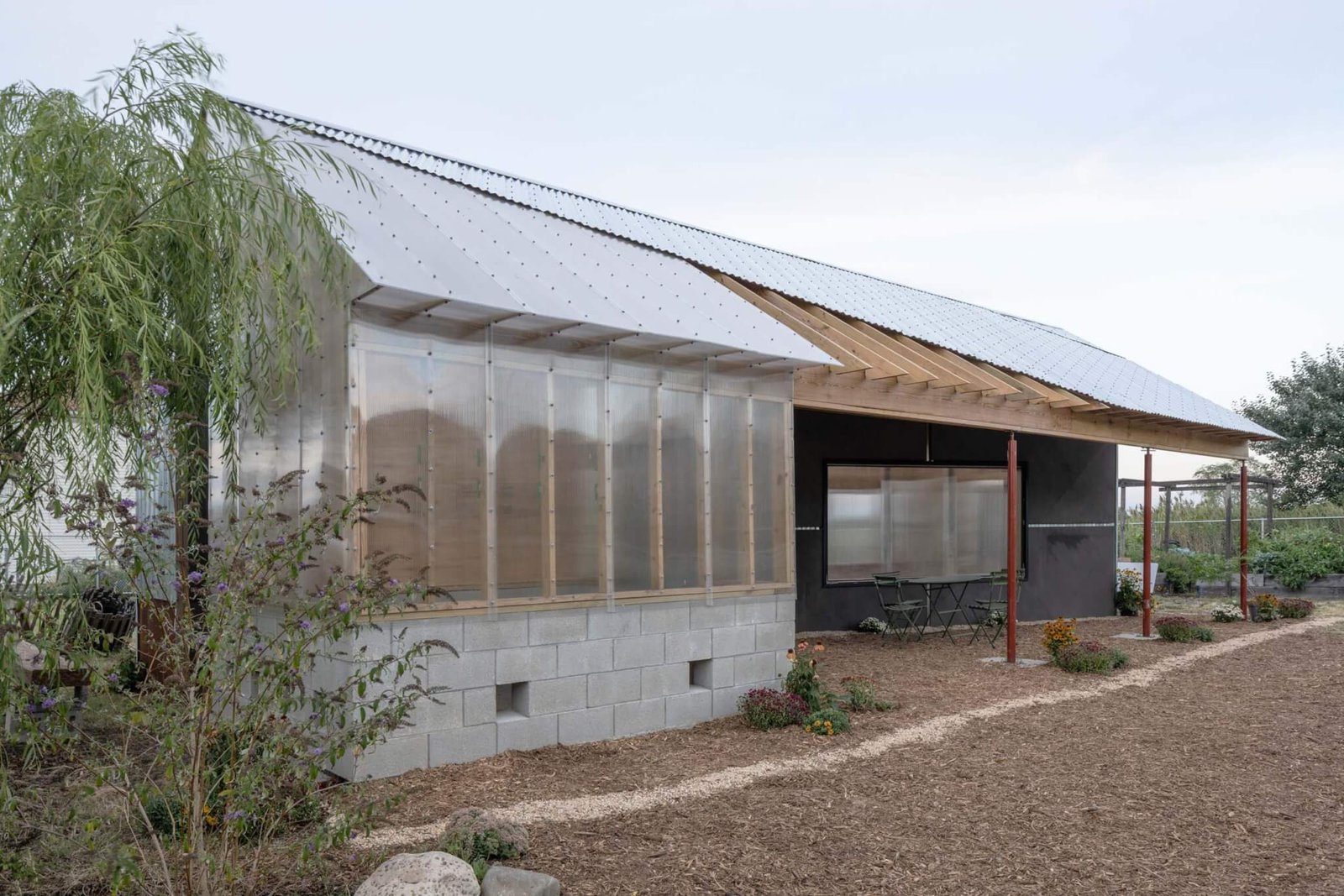 I visited this garden on a misty spring weekday in Edgemere, a neighborhood on the Rockaway Peninsula in Queens. Jackie Rogers and Laquetta Little welcomed me to share their experience directing the site. The Testbeds project couldn’t have come at a better time. The garden’s president and a longtime Edgemere homeowner, Rogers said the structure “helped people imagine the space” and what it could be. She recounted how, after a couple of years developing the garden near the northern end of the peninsula, watching the structure get built was a very exciting time, from seeing its foundations poured in late 2021 to witnessing its completion in late 2022. Its largest wall is faced in ridged high-performance–concrete panels originally used in a mock-up for a new condominium at 30 Warren Street in Manhattan. The pieces enclose a massive gold-tinged aluminum window frame, with clear twin-wall polycarbonate sheets sliding within the frame that open for airflow and views. Each of the structure’s three rooms combines the programs of greenhouse, toolshed, and gathering space. Aside from the salvaged materials, off-the-shelf materials like corrugated aluminum, raw lumber, and plywood compose the other facades, while CMU blocks and steel columns anchor the pavilion to its concrete floors and footings.
