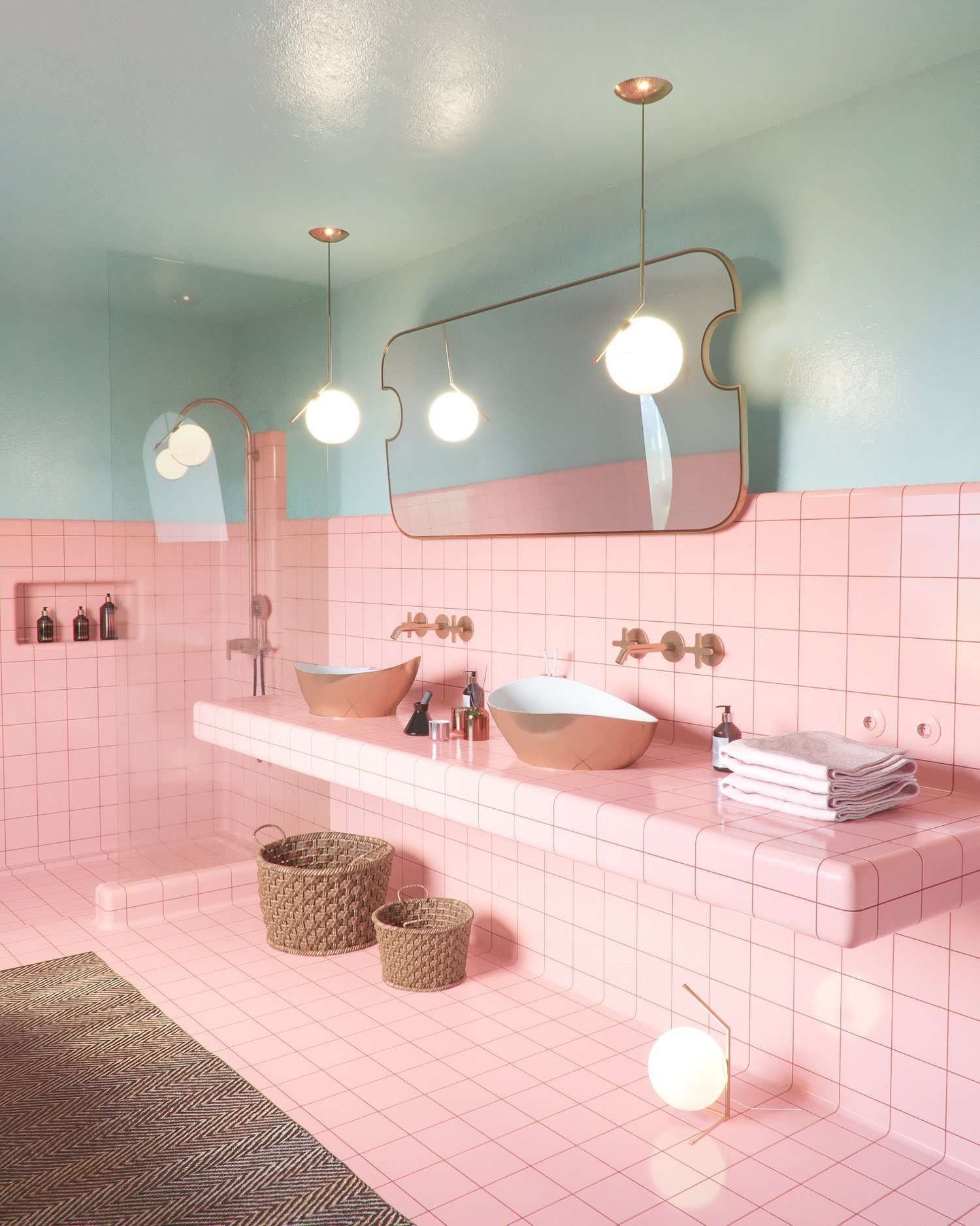 Other examples include non-residential projects like Lavabo Tri Suave or these mixed bathrooms with no gender distinction. Both include pastel pink tiles (either in flooring or walls) that were huge in the ‘50s, resulting in comforting contemporary spaces with a retro feel.