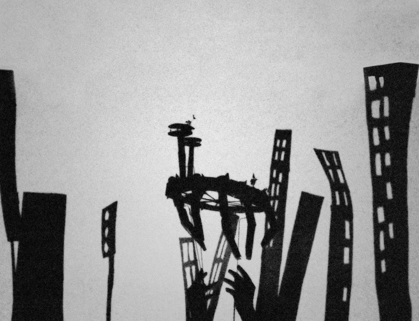 Visit SoHo’s Storefront for Art and Architecture this winter and you’ll tumble into a dark carnival where buildings morph, becoming elongated and spindly along the walls, and a haunting soundtrack resounds through the narrow gallery. The latest entry in Storefront’s Building Cycles series, The Great Ruins of Saturn takes the 1964 World’s Fair New York State Pavilion as its central character. Perhaps referencing the pavilion’s observation towers, artist Alvaro Urbano has erected small rotating platforms that support 2D maquettes, backlit to project moving shadows. A short animated video featuring similar penumbral figures plays in a curtained-off space to the right.