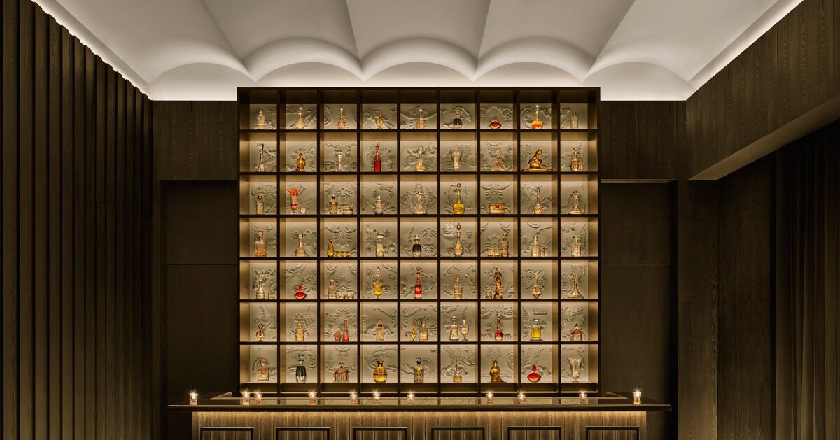 the restaurants, bars and entertainment areas blend black, blue and jade hues, inspired by the precious stones and extremely rare elements—sapphire, japanese jade and gold. materials such as walnut, oak, bronze, travertine, glass and silk can be found throughout the spaces, combined with yamato-bari – a traditional japanese wood cladding – and exotic greenery to create an eclectic mix of elements. the restaurants are spearheaded by world-renowned, award-winning michelin-starred chef Tom Aikens. the blue room, a romantic space with its luminescent sapphire and topaz colored upholstery—reminiscent of a painting by Yves Klein—high ceiling and magnificent, jaw-dropping views of the city, hearkens back to the glamour of old hollywood. meanwhile, the jade room and its garden terrace, which are set to officially open in early 2022, offer a transformative and unexpected experience, floating over 450ft (140m) above street level. with over 500 plants, trees and shrubs comprised of 25 different exotic species, this magical space transports guests from the frenzied and dynamic pace of city life to a beautifully serene oasis. a total of 140 tons (127,006kg) of fertile soil were brought all the way in from saitama prefecture just for this one-of-a-kind project.