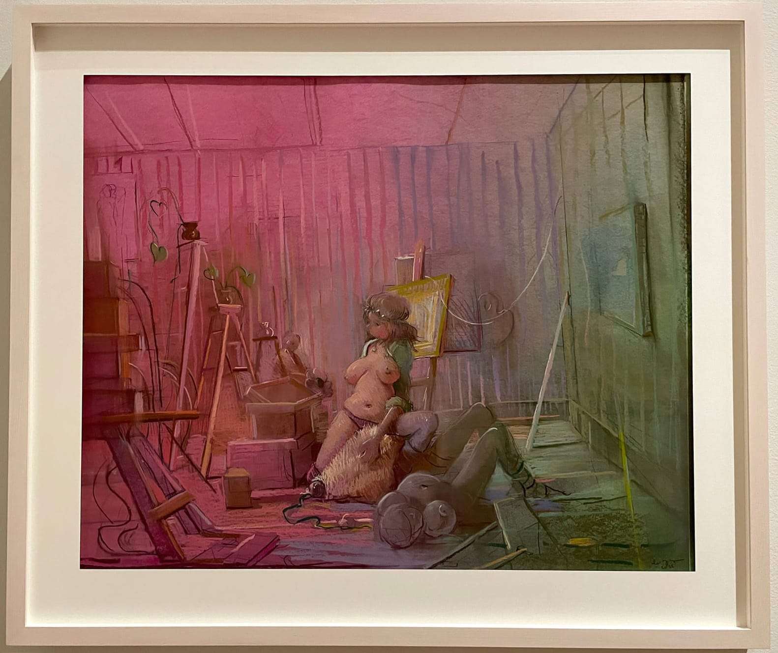 Lisa Yuskavage, “Iridescent Studio” (2025), pastel and ink (photo Natalie Haddad/Hyperallergic)