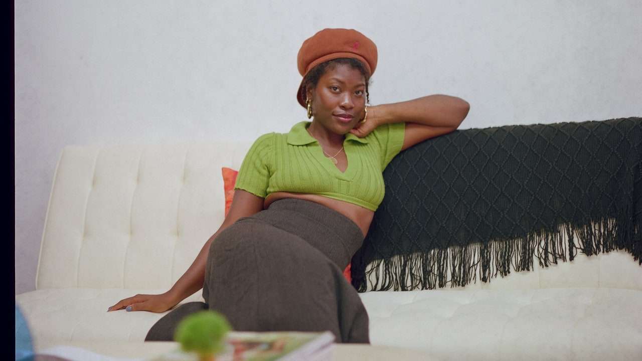 Sade Mims, the Brooklyn-based designer and founder of Edas, poses with her unique showroom display table.