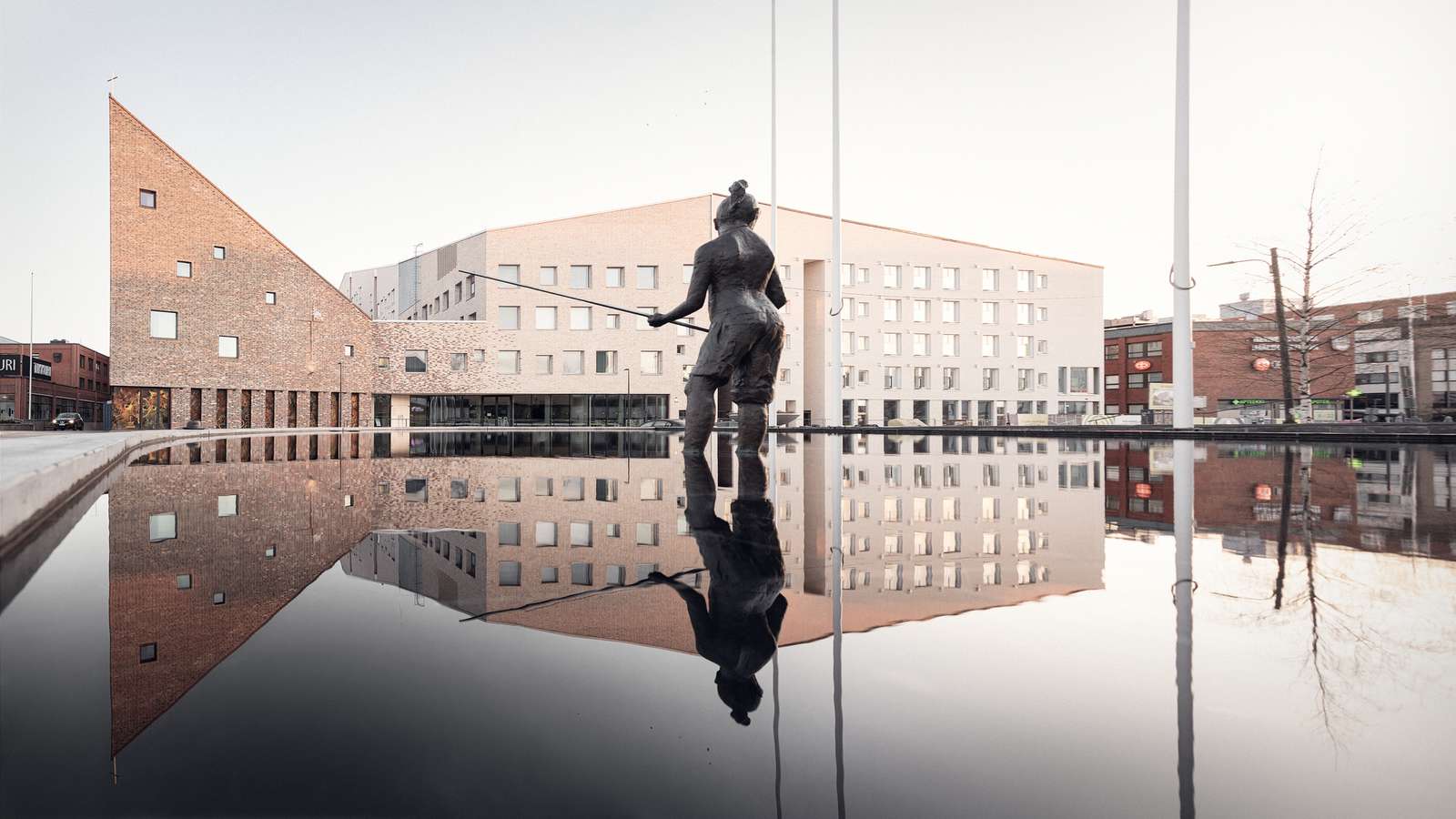 Text description provided by the architects. The Tikkurila Church and Housing is a multifunctional complex containing a church with a café, meeting spaces for the community as well as offices accompanied by an adjoining apartment building offering student housing and affordable rental apartments with shared facilities and retail space. The church is placed in the corner and integrated into a city block. Together, the church and the housing form one unity with a diversity of functions to serve the residents of Tikkurila, one of the fastest-growing and ethnically most diverse areas in the metropolitan region of Helsinki. Located in the vicinity of the main airport, Tikkurila is a major hub for connective traffic and an important center of industry and business. Located along the main town square opposite the town hall, the church and the adjoining housing is part of the transformation and densification of downtown Tikkurila.