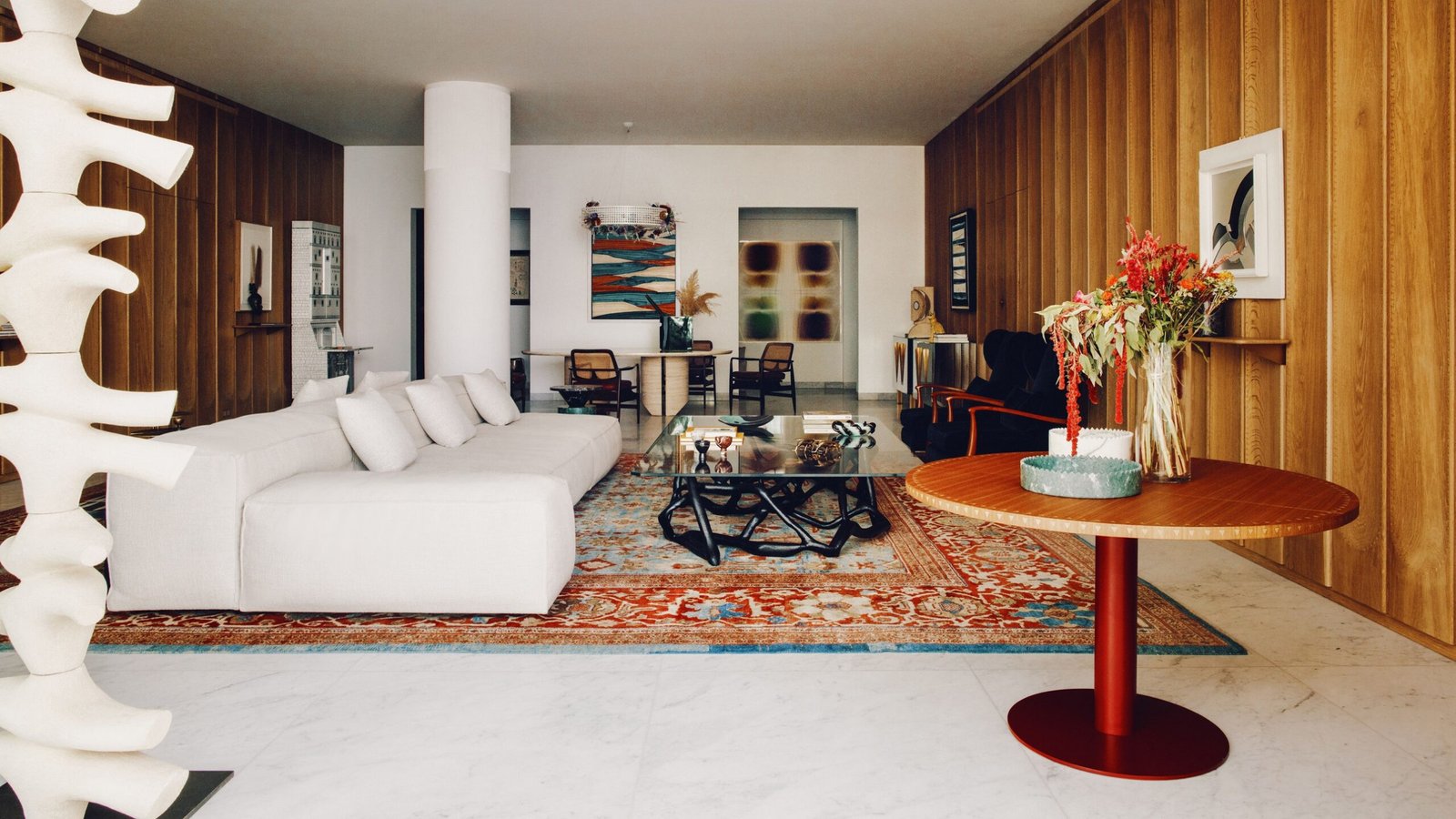 To capture this spirit, the pair came up with the defining element of the space: a series of wooden panels cladding opposing walls of the living room. Each piece is handcrafted and carved with a tiny triangle motif that nods to the clients’ Egyptian heritage. Between the panels are carefully devised slats that make for easy hanging along the walls. A custom table by the architects in the corner seamlessly ties the room together, with triangular engravings along the side and a rich red base that complements the hues of the Ziegler rug.