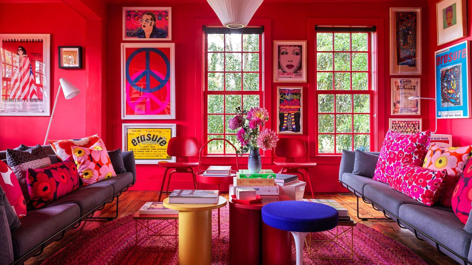 Albers’s theory is brilliantly manifest at a 13-acre Stuyvesant, New York countryside retreat, which Shellhammer and husband Georgi Balinov own. In a few short months, they transformed the 1840s three-bedroom farmhouse and the property’s eight (yes, you read that right) additional structures into a modernist Eden, with all the amenities for hosting their family and friends just two and a half hours from Manhattan. As a charming signpost indicates, there’s a swimming pool, sauna, network of bars and lounges, movie theater, and vegetable patch, not to mention an abundance of quiet spaces. The estate’s name, Rode Barns, comes from the three showstopping stables, painted in vivid hues inspired by Alber’s 1943 oil painting, Related (red).
