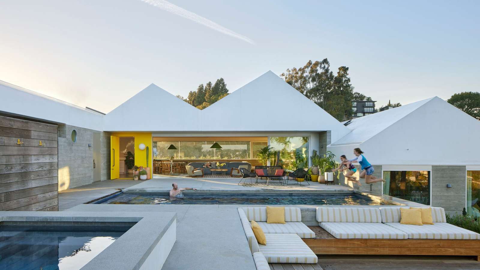 Not just any new build would do. Bestor and her clients wanted to create a place that would feel connected to its predecessor as well as the ground it stood on. “I wanted to extrude the hillside, in a way,” Bestor says. “To take this organic shape and make it into something abstract.” The result is an airy, indoor-outdoor structure with board-formed concrete walls and a sculptural and zigzagging white roof made from prefabricated scissor trusses. “It’s meant to look as if it’s stepping down the hill,” she explains, “a bit like a slinky.” Macomber points out another charming visual narrative: “There’s a nautical theme to the Soriano house, with its rounded prow living room, and we designed the low whitecaps of the new house to be its sea.”