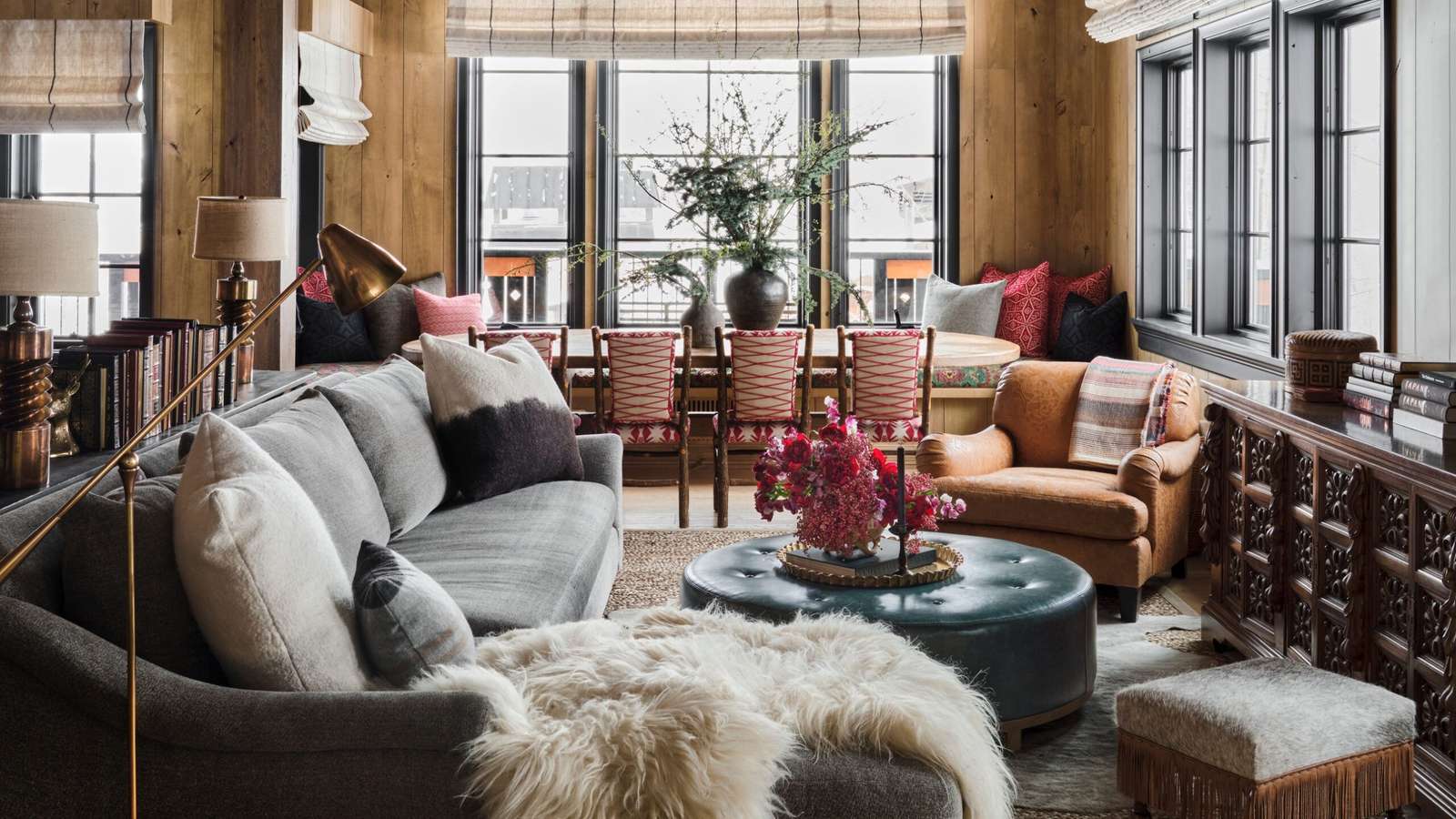 Indeed, the 10,000-square-foot property unfolds almost like a storybook, with surprising twists and turns animating the central narrative: a tale about a playfully sophisticated mountainside retreat where a family comes together to relax and spread cheer. Looking at the grand salon on the top floor, covered head-to-toe in oak planks and furnished with roomy rolled-arm sofas strewn with fur throws, one might think of an elegant chalet in Gstaad. A more rustic ambience pervades the primary suite, whose wooden bed alcove is lined with a fabric featuring Tyrolean motifs, and whose rich color palette calls to mind the American Southwest. Further along, seeing the lower-level ski room, with its checkerboard floor, plaid upholstery, and candlestick chandelier, one could easily imagine a Scottish manor. Then there’s the dimly lit game room and bar, a cozy space completely wrapped up in flowing draperies, like a luxurious tent. “Isn’t it fun?” says Fulk. Certainly, it is.