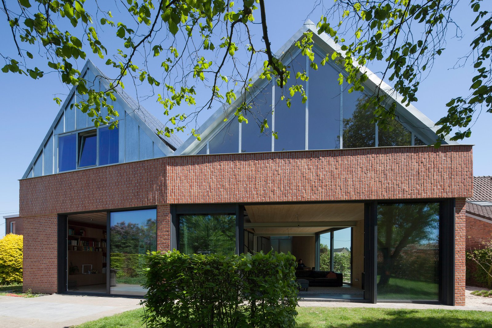 Text description provided by the architects. In the early 2000s, a modest red-brick farmhouse house was converted into an L-shaped home. Due to this shape, there was a limited relationship between the outside and specifically the garden. For this reason, the focus of this extension was the relationship of the garden to the indoor spaces. Therefore, a triangular addition was built that has the garden as its focal point and creates an outdoor area perpendicular to the street. This gesture opens up towards the garden in both plan and section. As such it minimizes the visibility of any intervention from the street elevation.