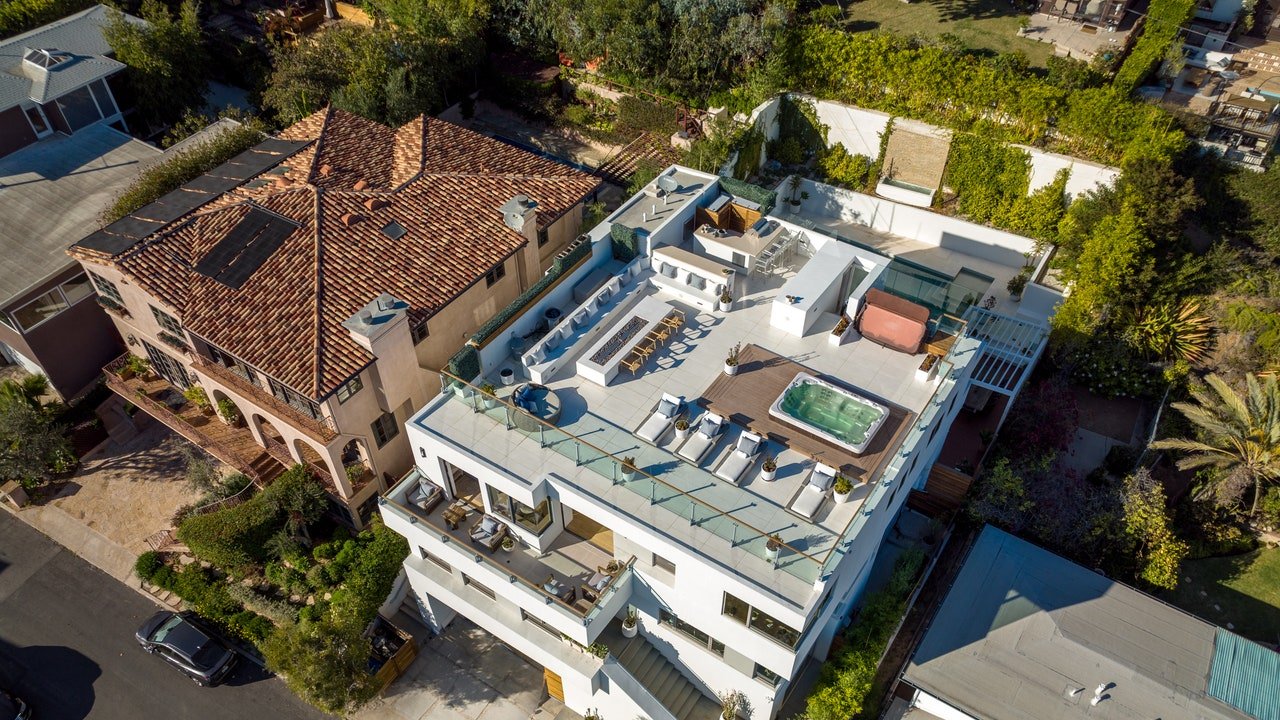Out in the backyard there’s an infinity-edged pool with a waterfall backdrop, lounge and outdoor dining areas, plus an ipe wood deck and additional wood accents that match those inside. Additional outdoor space is available on the stunning rooftop deck which has an outdoor kitchen, a large hot tub, a fire pit, 360-degree views, and tons of room to lounge. The listing is held by Heidi Lake of Sotheby’s International Realty at the Beverly Hills Brokerage and James Respondek of Rodeo Realty.