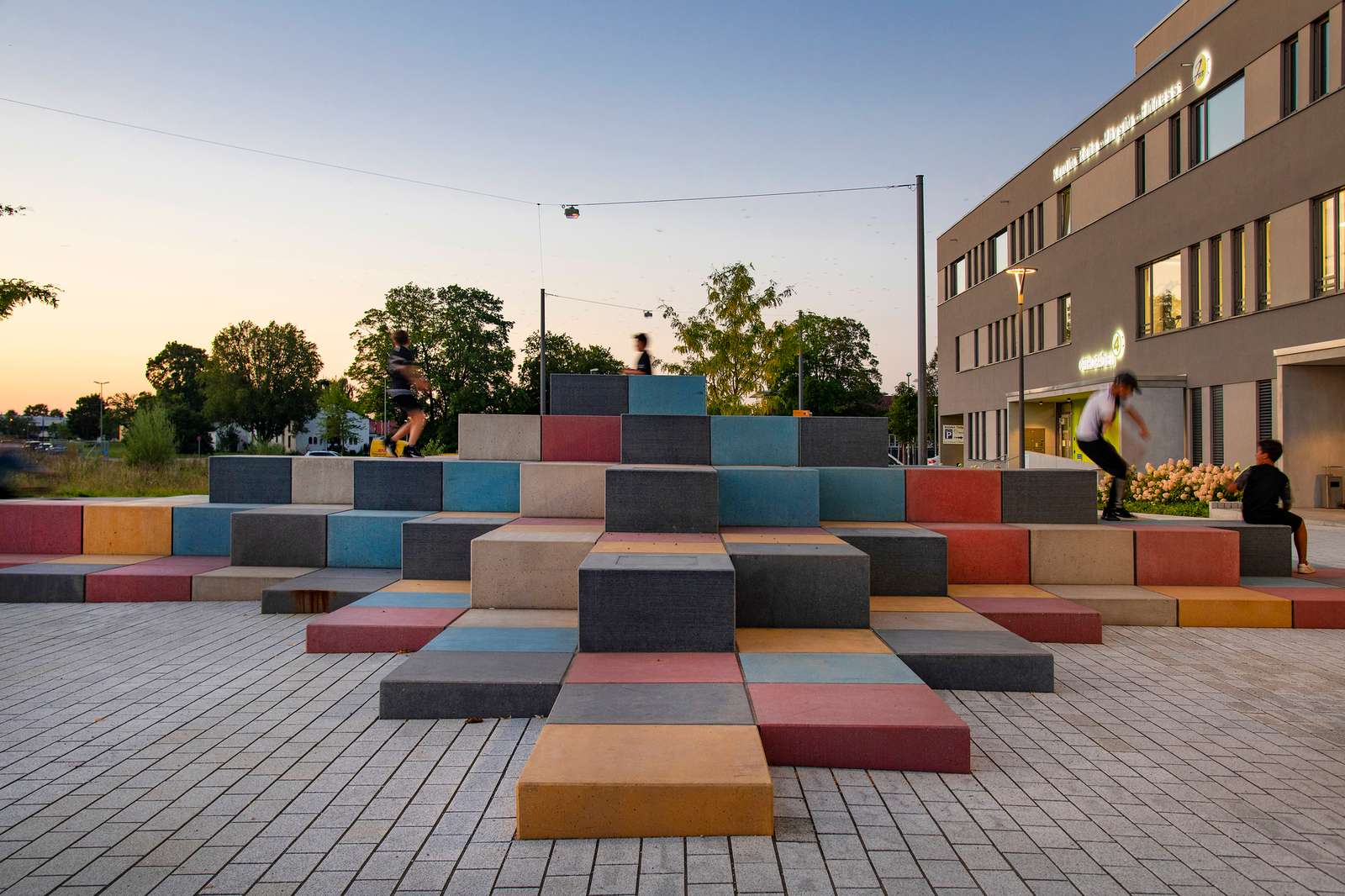 Together with the concrete cubes, the paving creates a uniform joint pattern. The center of the square is formed by an extensive, star-shaped seating and lounge sculpture made of colored concrete blocks. 165 cubes are made of concrete colored through with pigments, 22 of translucent concrete with colored LED interior lights. In daylight, the colored concrete cubes dominate the appearance of the sculpture.