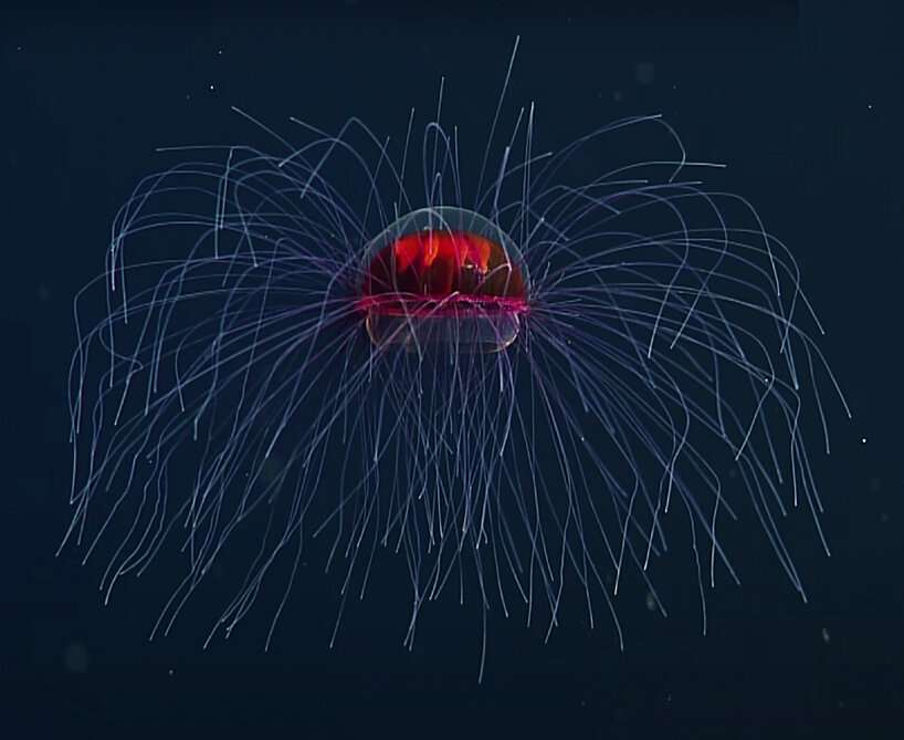 MBARI first discovered the crossota species back in 2018, but this latest sighting was ‘one of the most striking. [it was] a wild sight in the midnight zone. the remarkable coloration of this jelly tipped off scientists that they had found a previously unknown species,’ states the research team. that said, here’s what MBARI knows so far about the psychedelic jellyfish: it has a maximum diameter of 2.8 centimeters and a depth range of 1,000 to 4,000+ meters. additionally, the scientists successfully mapped out the biological differences between the male and female species.