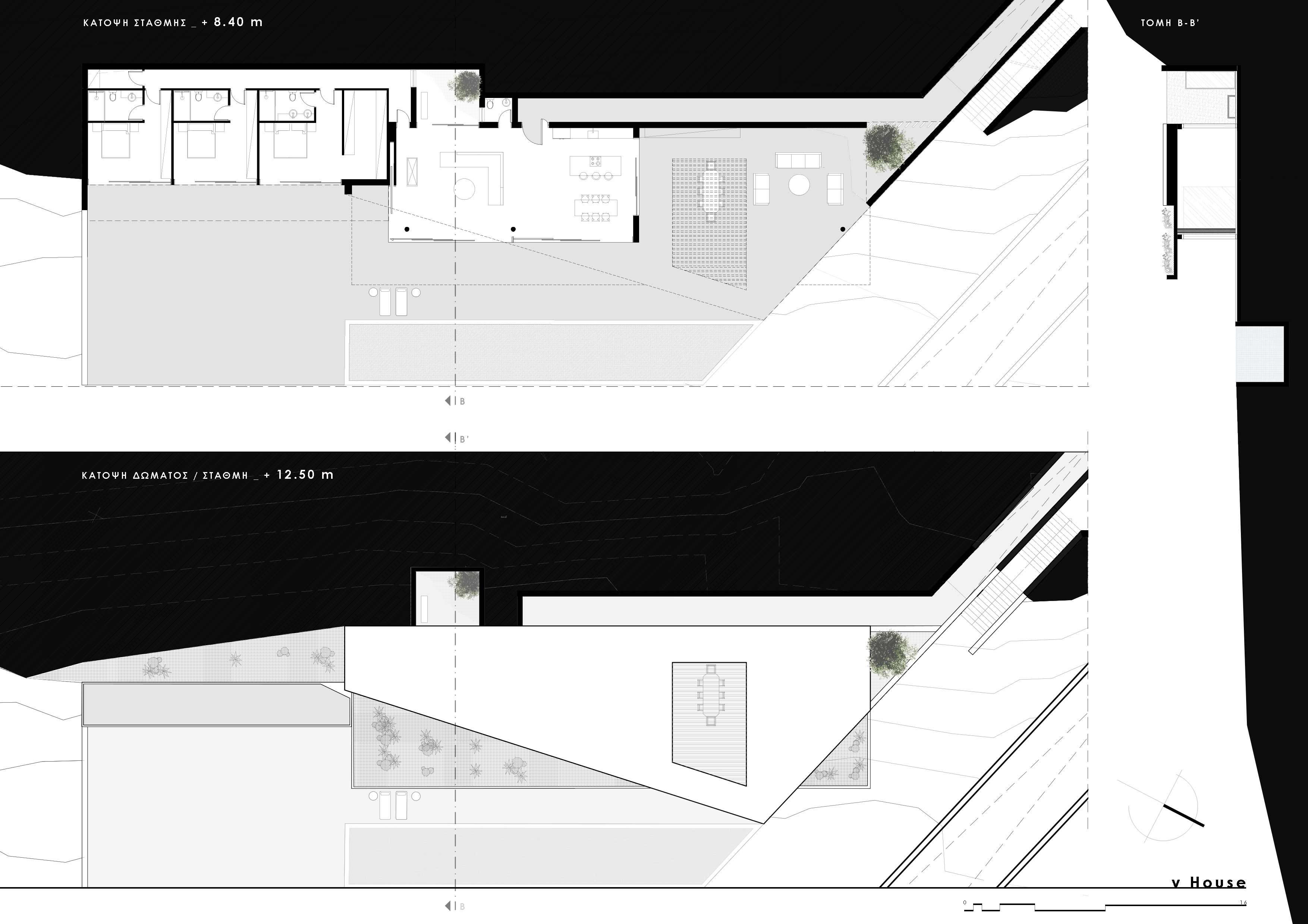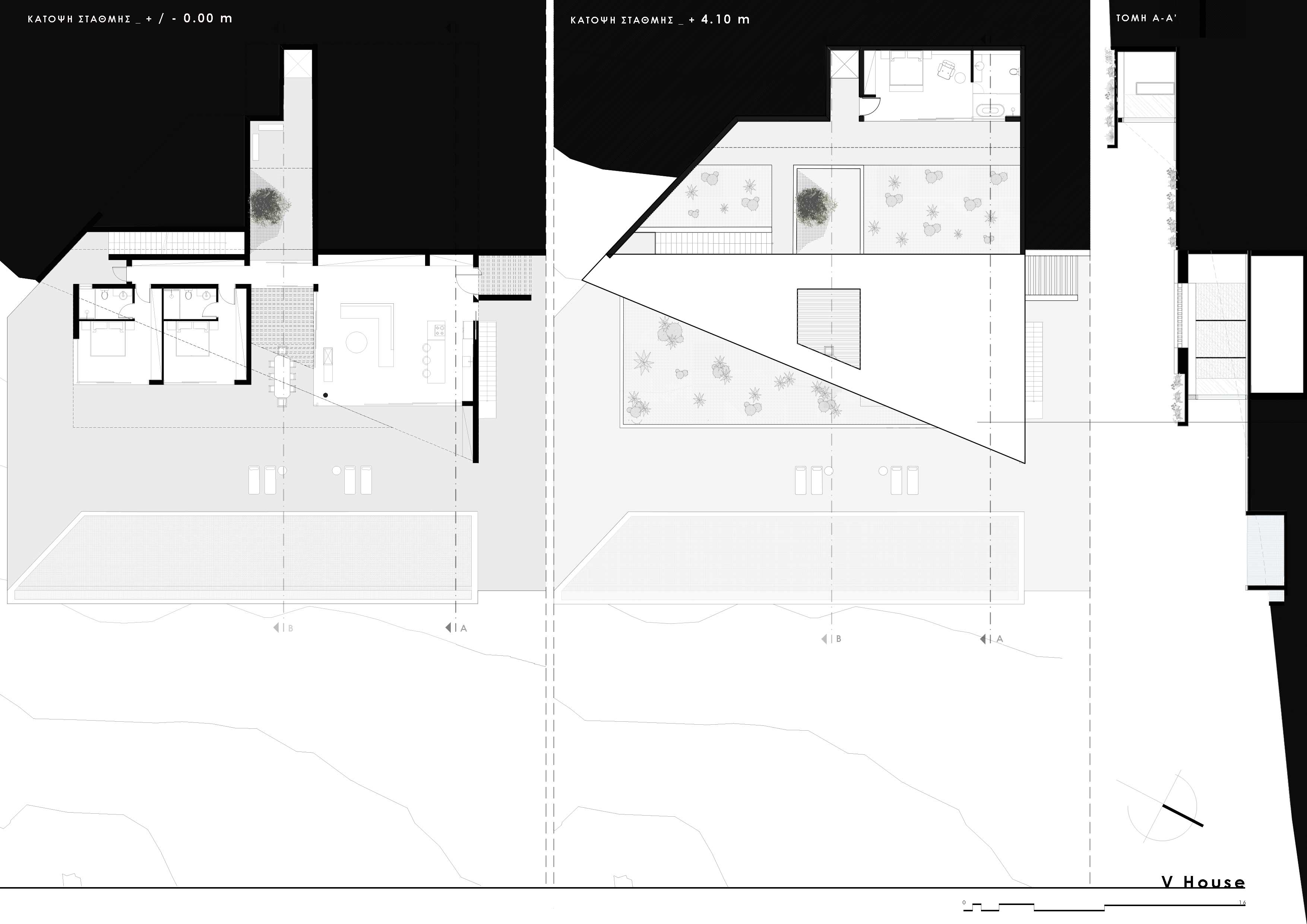 The house-[V] consists of indoor and semi-outdoor spaces. All of them are located beneath the white prism. The guest house is an underground structure, located on higher level and follows the geometry of the wedge .The [v]-house consists of day’s & night’s accommodation areas that are structured in a row.