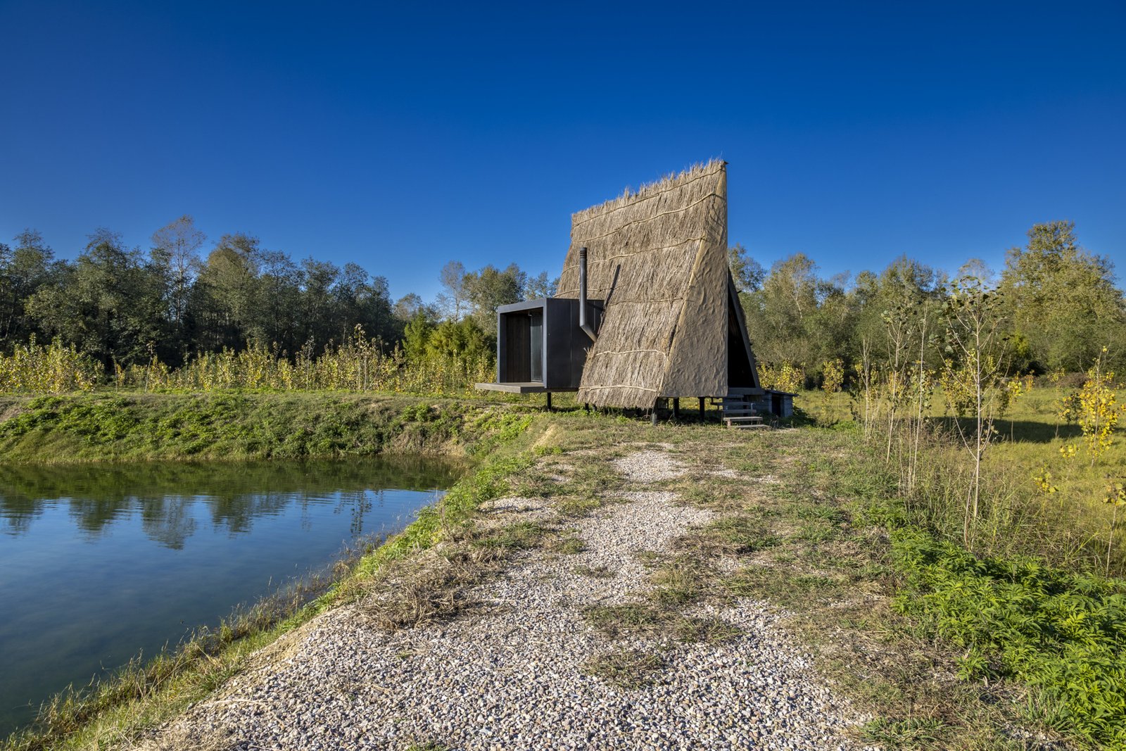 The final cover of the cabin was thatch and clay and straw (A type of plant fiber which has been used to cover the roofs of rural houses) for proper coordination with the background and maintaining the available space so that it can be in harmony with the rural houses left from the past. The long gable roof has been used at cabin form to be close to the rural housing typology.