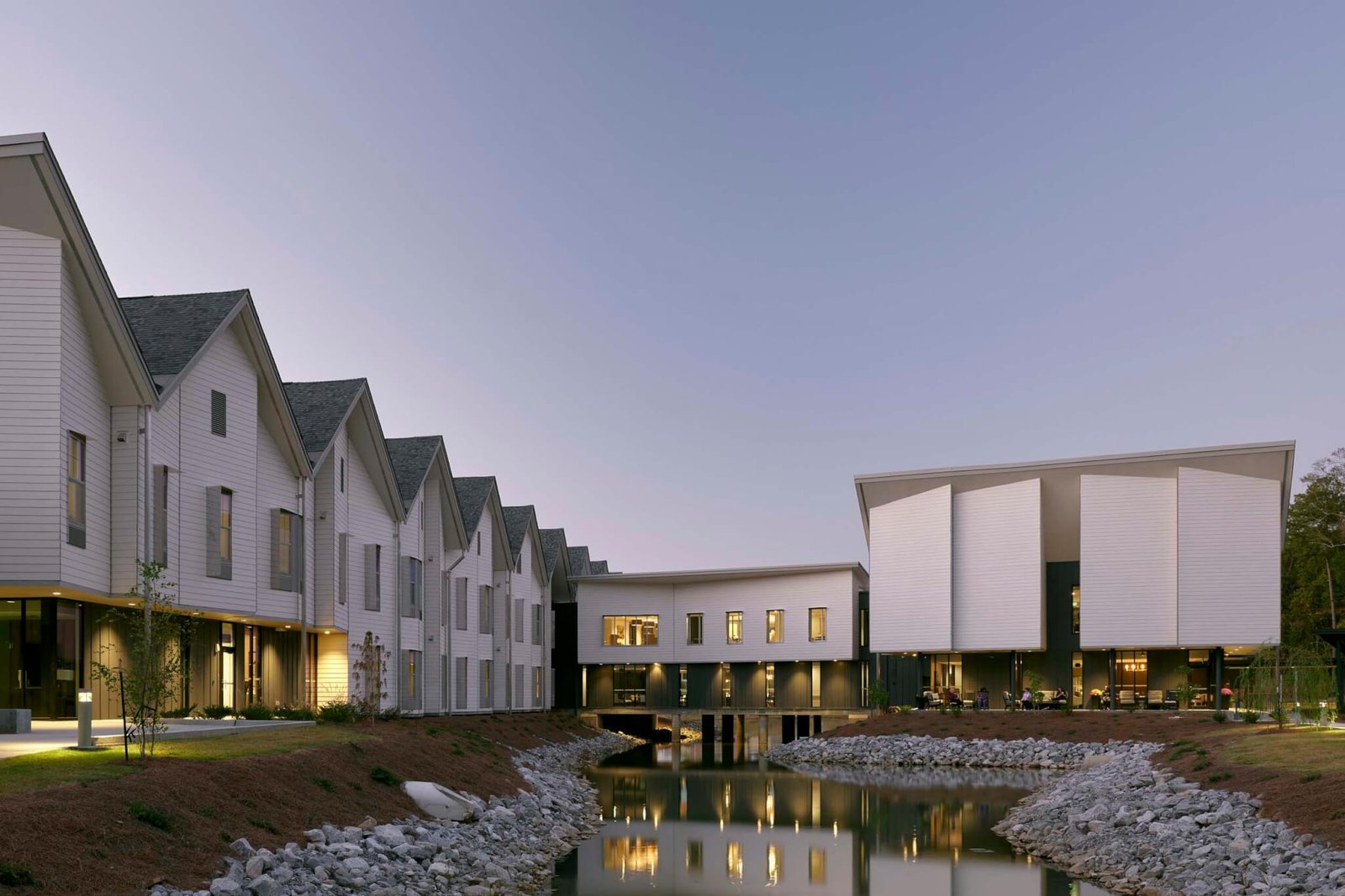 Housing ranks high on Duvall Decker’s design priorities and admirably so. The series of affordable duplexes the firm realized in Jackson’s Midtown neighborhood evince a supple approach toward form, where modernist lines are resolved in deep porches. A more recent complex in a Greenville, Mississippi, suburb opts for a dense arrangement of multistory houses around interior courts, with an eye toward creating community. But while those projects made interesting use of convention, this senior living facility in Jackson’s metro region consciously breaks with the norm. “This is a relatively new typology in our country, and they are usually nostalgic facades with institutional interiors,” Decker said. Both he and Duvall had had to move their parents into such places. “We had seen all these small ‘misses’ in livability, particularly when it came to residents’ individual rooms,” Duvall recalled. Rather than concentrate the program in a single block, they arrayed the living units into two wings sited along a creek and connected by a “bridge building” containing shared spaces and amenities. Each room has large windows and walls that lean in and out, increasing sightlines and sunlight. The serrated edge of the plan is picked up in elevation by the butterfly roofs. “We think it dignifies senior living,” Decker said. “It opened last August, and it was filled by December.”