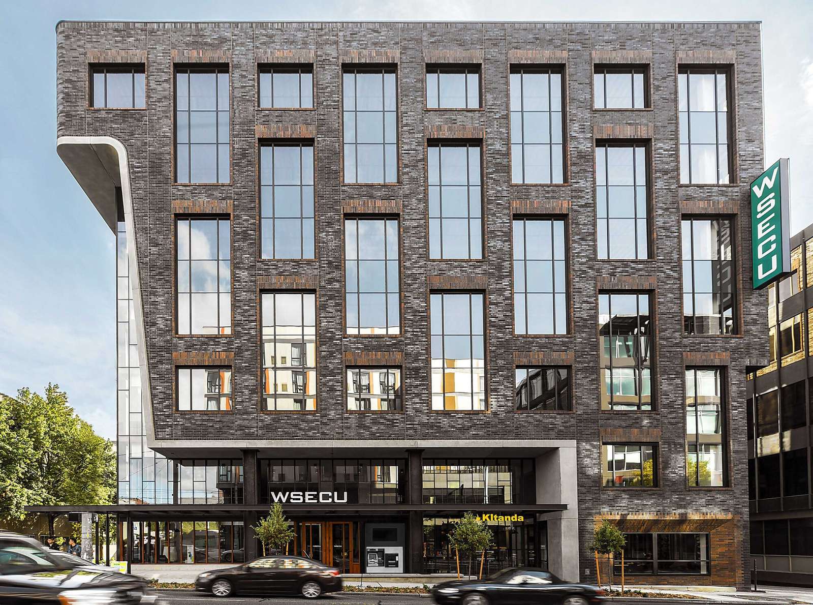 “When it comes to commercial buildings like this, it’s important to consider development in its specific context. We wanted to create an environment that was an 18-hour experience; it’s imperative to create a vibrancy at the ground plane. WSECU saw that vision as well,” said Kyle Gaffney, SkB Architects co-founder, and project designer. The project, on its small but prominent site, succeeds in creating a building that acts and feels like a part of its neighborhood and that also provides a signature identity for WSECU.