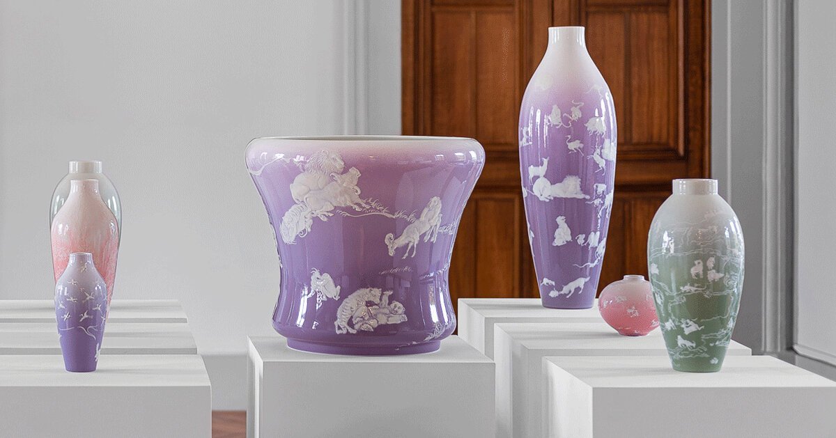 chinese artist yang jiechang presents his new unconventional artwork at galerie de sèvres in paris. titled ‘tale of the 11th day’, the exhibition accommodates a series of eleven embossed vases clad in a pastel palette of colors, that represent paradisiacal sceneries. his overall work follows the pâte-sur-pâte (paste-on-paste) technique —a light relief decoration process made with liquid porcelain paste spread with a brush— adding a unique texture to the pieces.