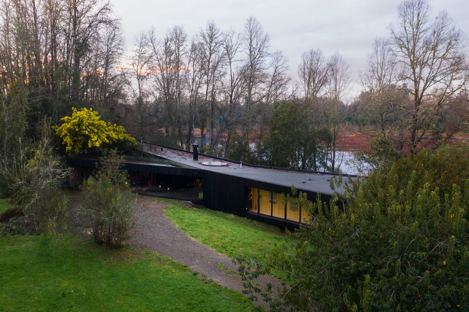 Text description provided by the architects. From the T house of Cazú Zegers, designed in 2009 and built in 2011 on the shore of Laguna de Aculeo in Chile, a way of naming the projects arises, which comes from the alphabet, it is the alphabet of the poetic word and with this a series of houses that are the abstract synthesis of a letter that becomes a work of architecture. It has to do with the creation of reality through language. Each “letter house” has a unique dialogue with the landscape, a territorial dialogue where the work is a unity between landscape and architecture. The Ye house is a pavilion suspended over a landscape of myrtles with a privileged view of the Cayumapu River and its wetlands, created after the earthquake of May 29, 1960, in Valdivia. These wetlands have a rich fauna of birds such as the endemic black-necked swan and a dense vegetation layer composed of reeds and lotus flowers, among other species that are very characteristic of these territories.