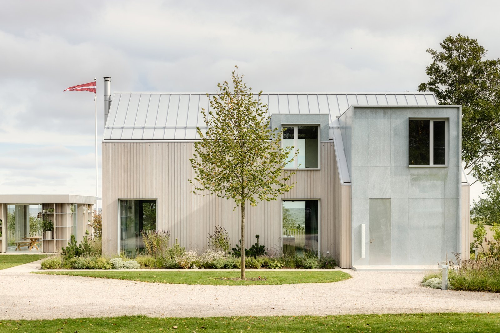 The property consisted of four standalone and rather mismatched buildings – the main house, a garage, shed, and garden house – each with its own character. Open AD identified ways to keep all the structures, unify them stylistically and tie them in with the coastal location. The two dominant cladding materials – larch and galvanized steel – are inspired by the colors of the sea and sky. The shape of the buildings and their gable roofs echo the vernacular architecture of the historical fishermen’s dwellings, which the area is known for.