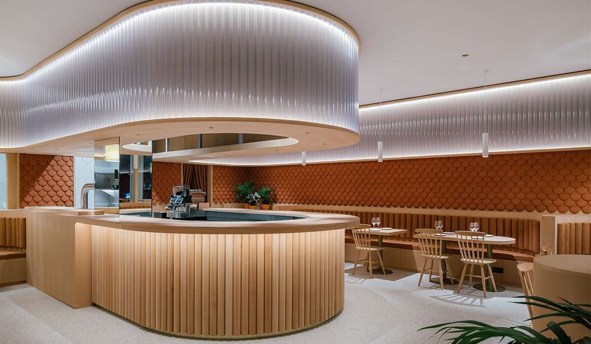 all this translates into a curved geometry that references the swell of the ocean and is arranged in three different bands. the lower band incorporates all the circular benches of the restaurant and the bar which is shaped as a hard and resistant intermediate band that is attached to the walls. meanwhile, the upper band houses the ambient lighting of the room as well as the overbar.