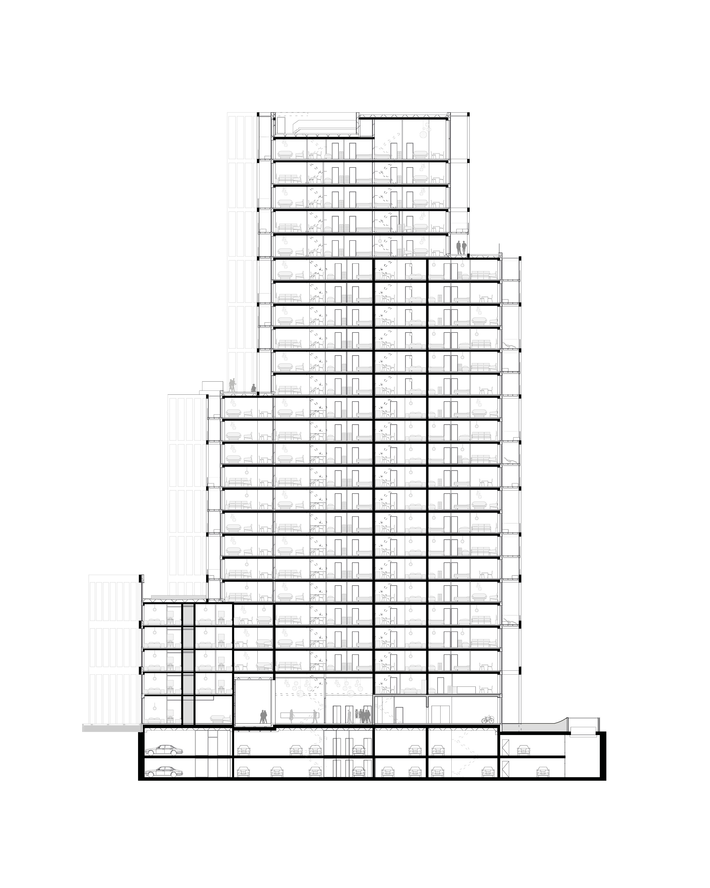 The 21.082 m building consists of five layers at its base, including a hotel with 108 rooms, on top a 25-storey tower with 134 dwellings and below parking on two underground levels.