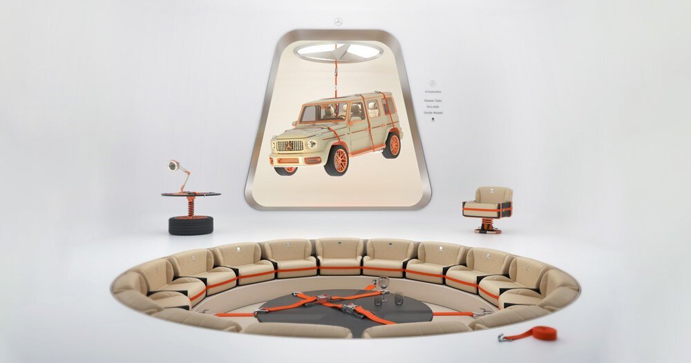 in a play of deconstruction, zyva studio and charlotte taylor unveil a reinterpretation of the G-wagon created with mercedes-benz. isolating and repurposing key elements of the iconic car, the team proposes a series of furniture pieces within a fictional scene. here, the digital world intersects with the motor world’s heritage of handmade craftsmanship. the project, dubbed ‘G-construction,’ is conceived following the auto company’s plans to bring its G-class into the world of NFT, establishing the car as an ‘NFG’ (non-fungible G-class). with a history spanning 40 years, the designers relaunch the iconic vehicle into a new digital space that is unique to this contemporary era.
